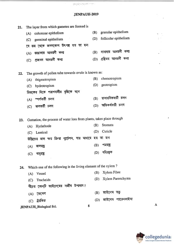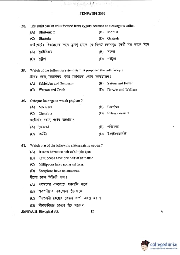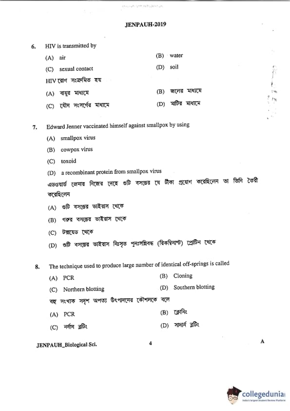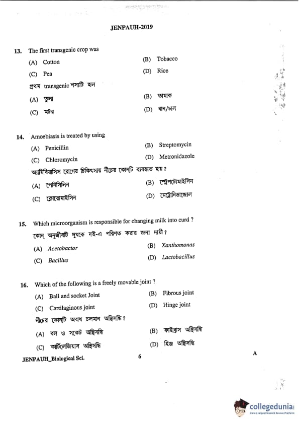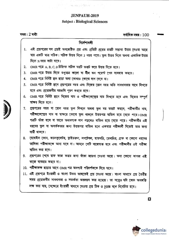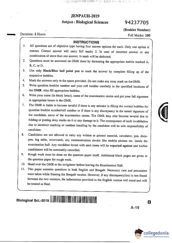 | WBJEE JENPAS UG 2019 BIOLOGICAL SCIENCES Question Paper PDF | WBJEE JENPAS UG 2019 BIOLOGICAL SCIENCES Answer Key PDF |