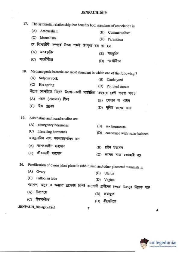 WBJEE JENPAS UG 2019 BIOLOGICAL SCIENCES Question Paper with Answer Key PDFs