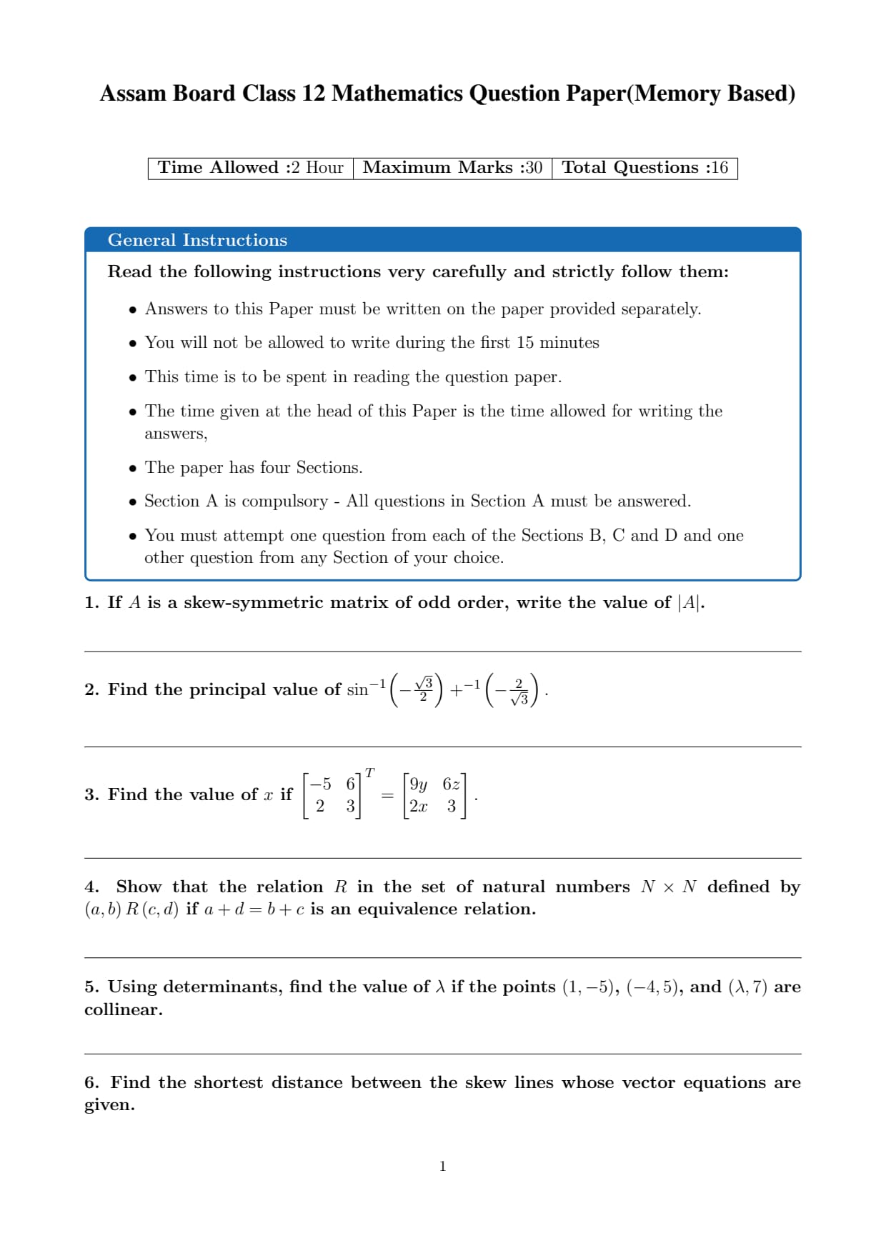 Assam Board is conducting the Class 12 Mathematics Board Exam 2026 on February 27, 2026. Class 12 Mathematics Question Paper with Solution PDF is available here for download.