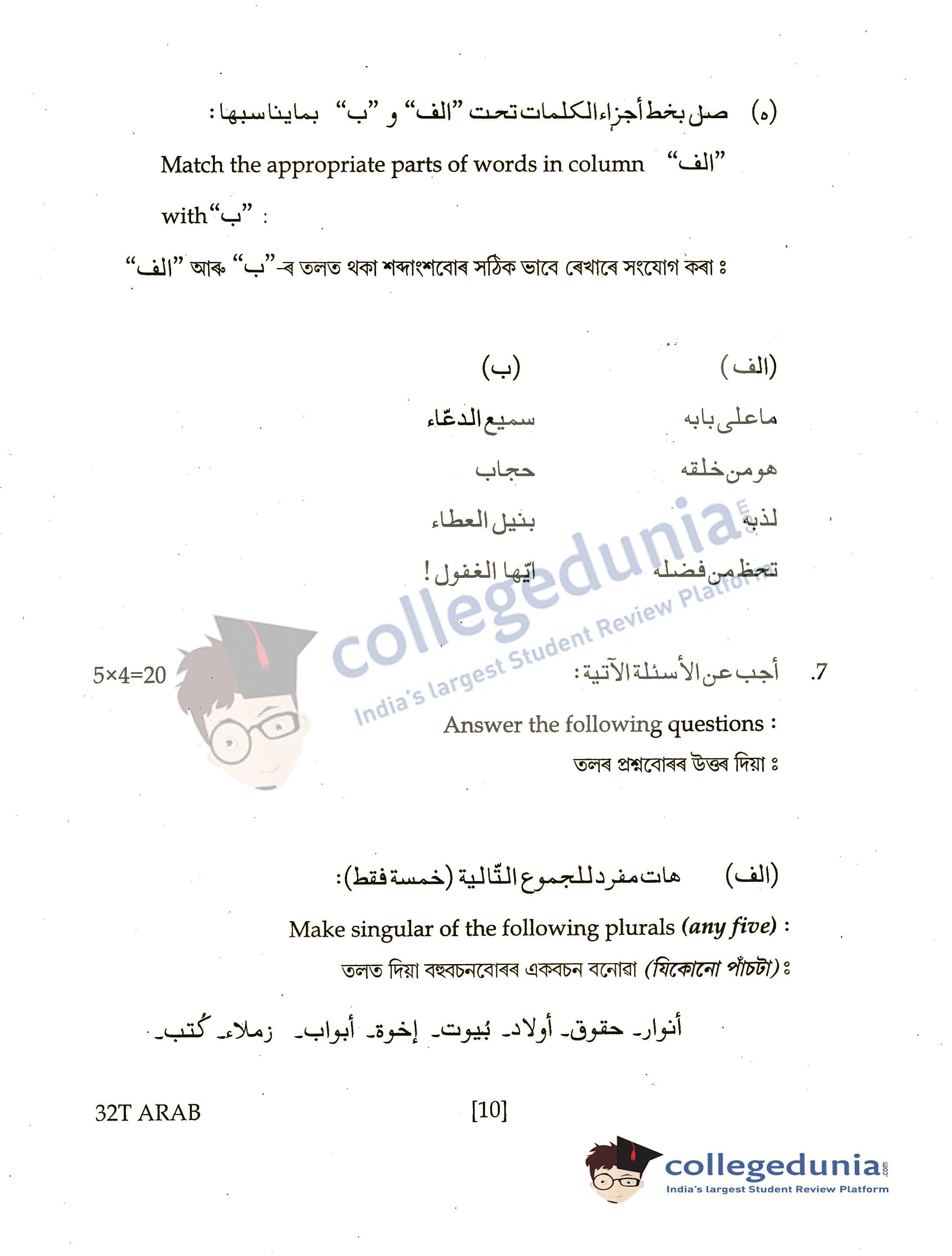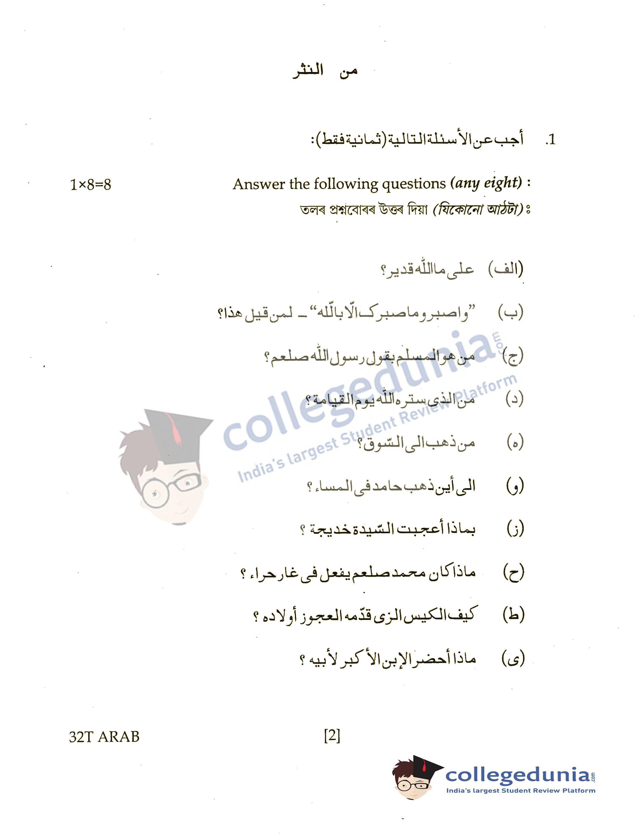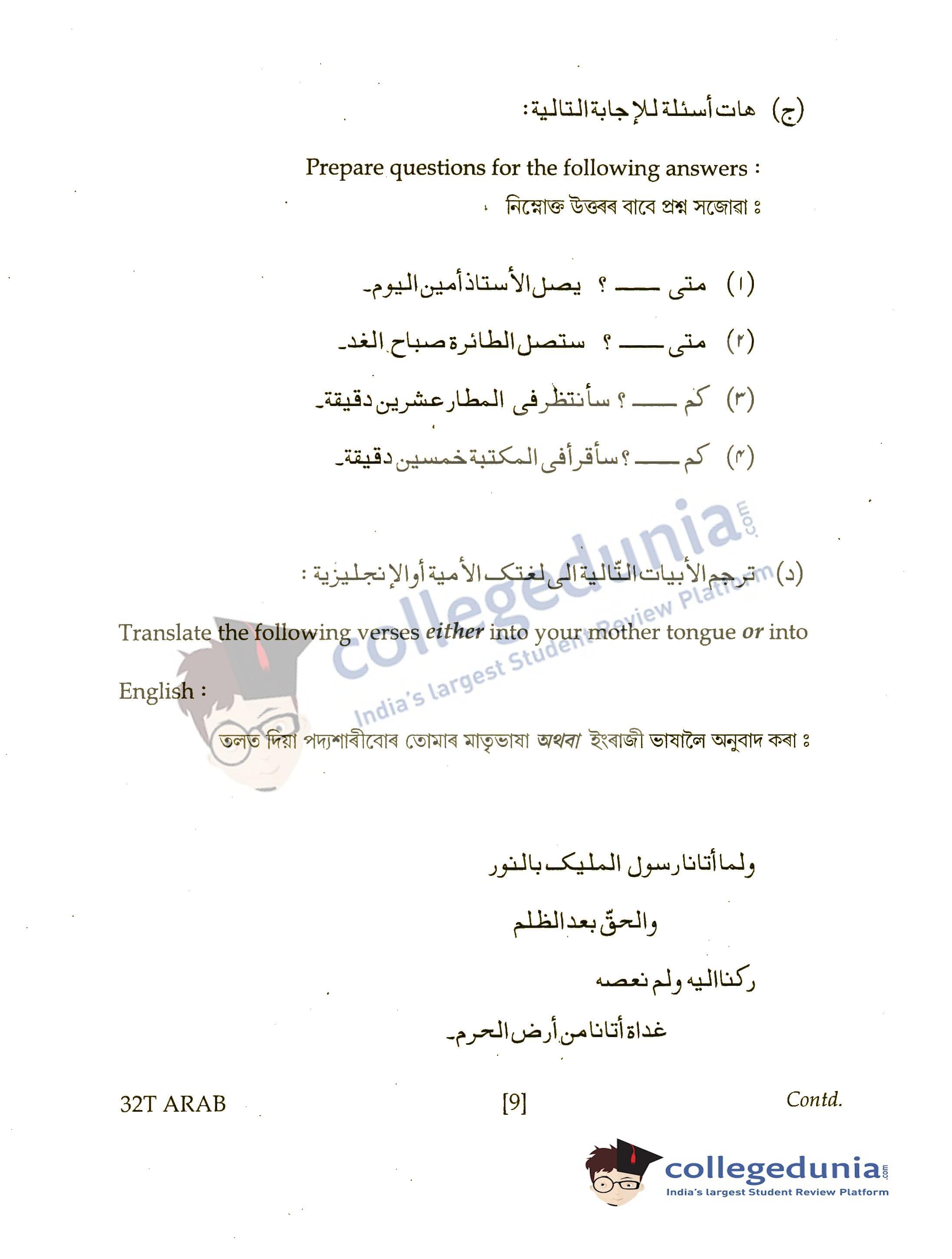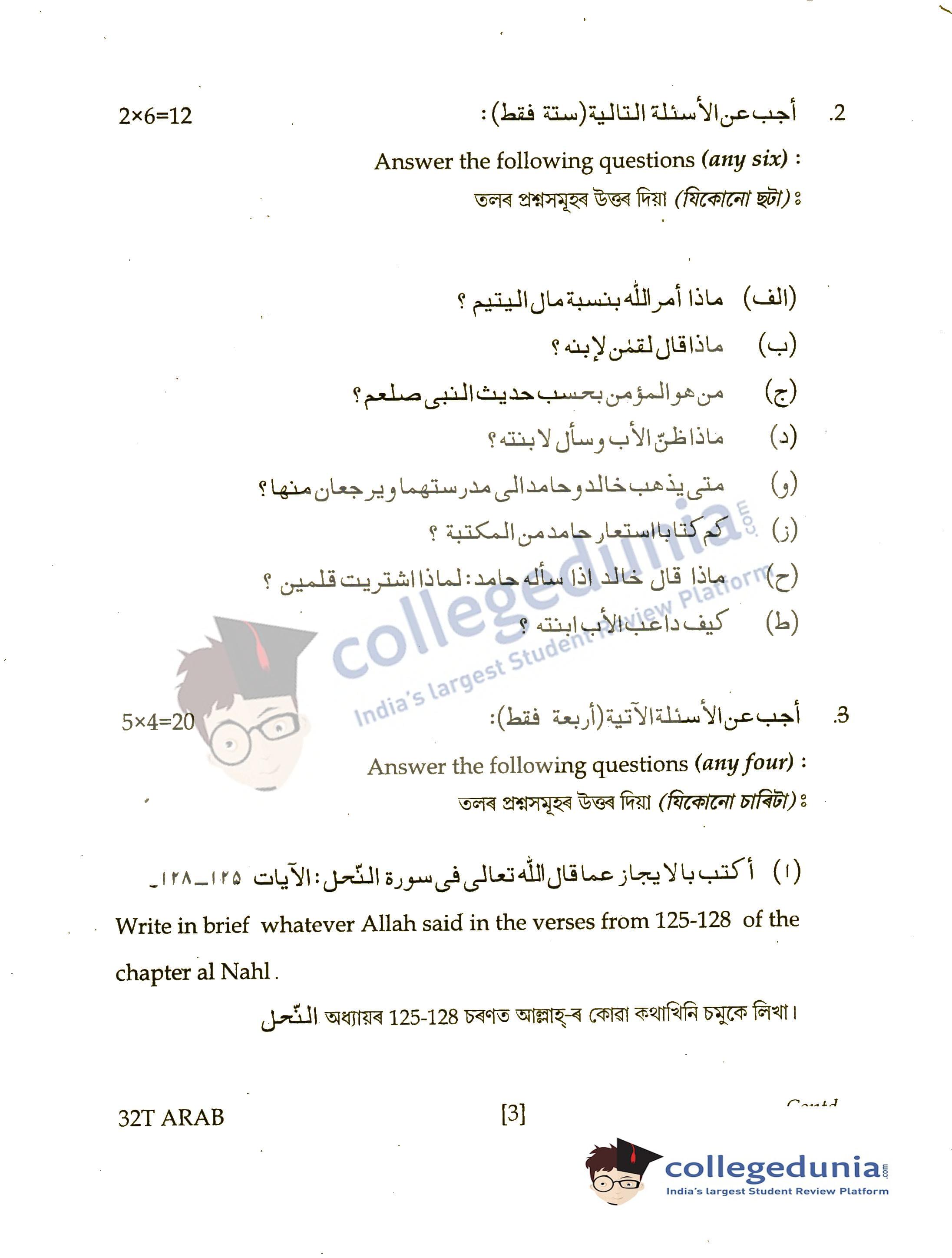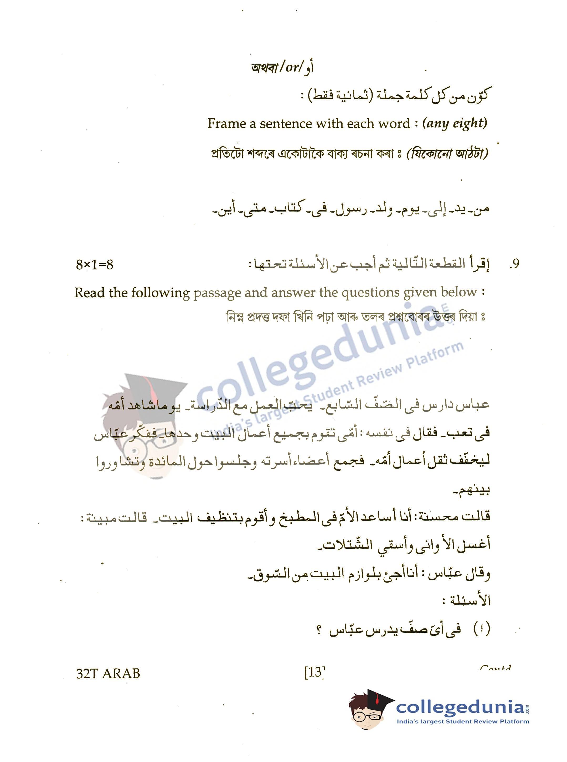 Assam HS 2nd Year Arabic Question Paper 2022 with Answer Key (April 9)