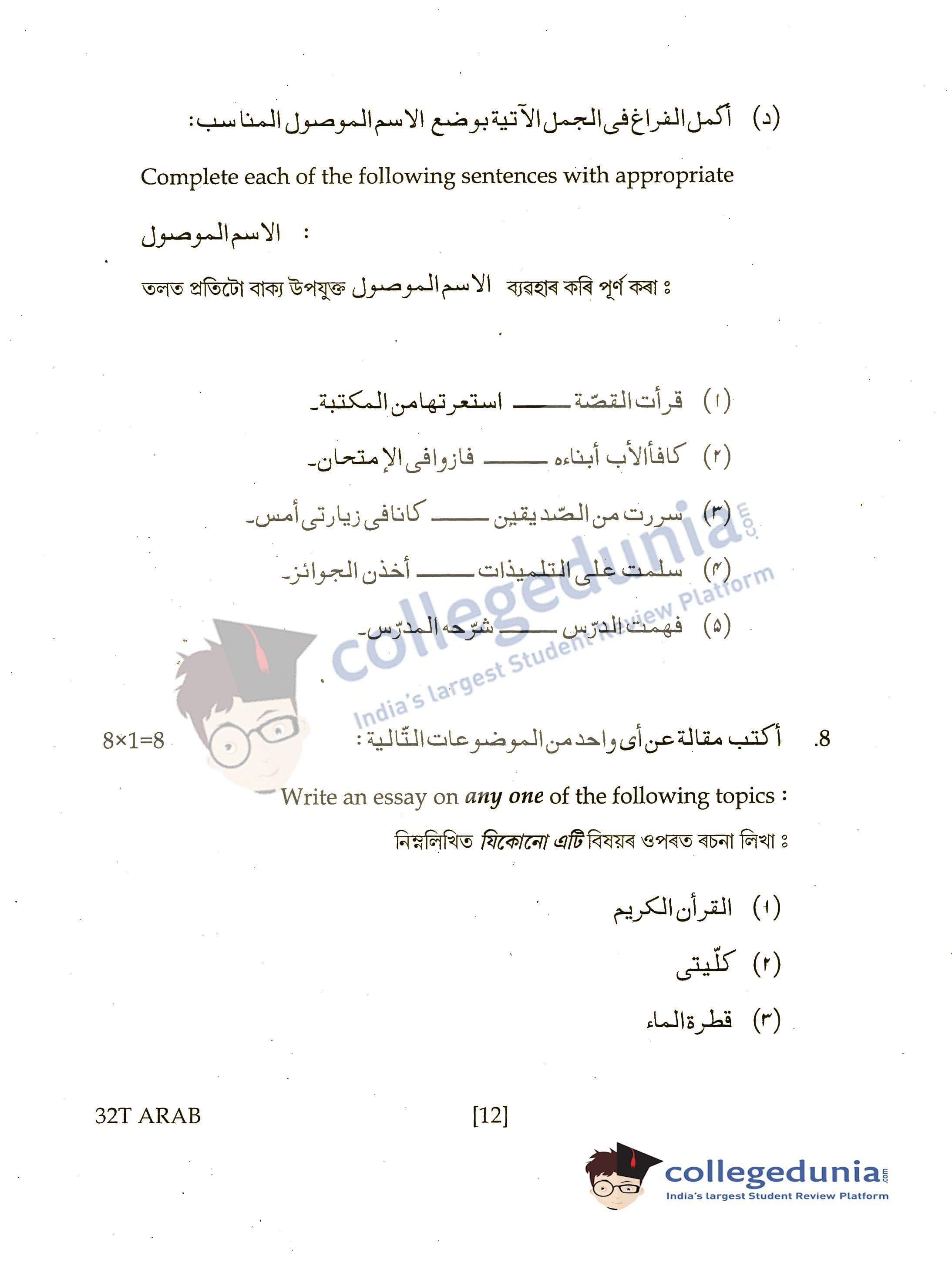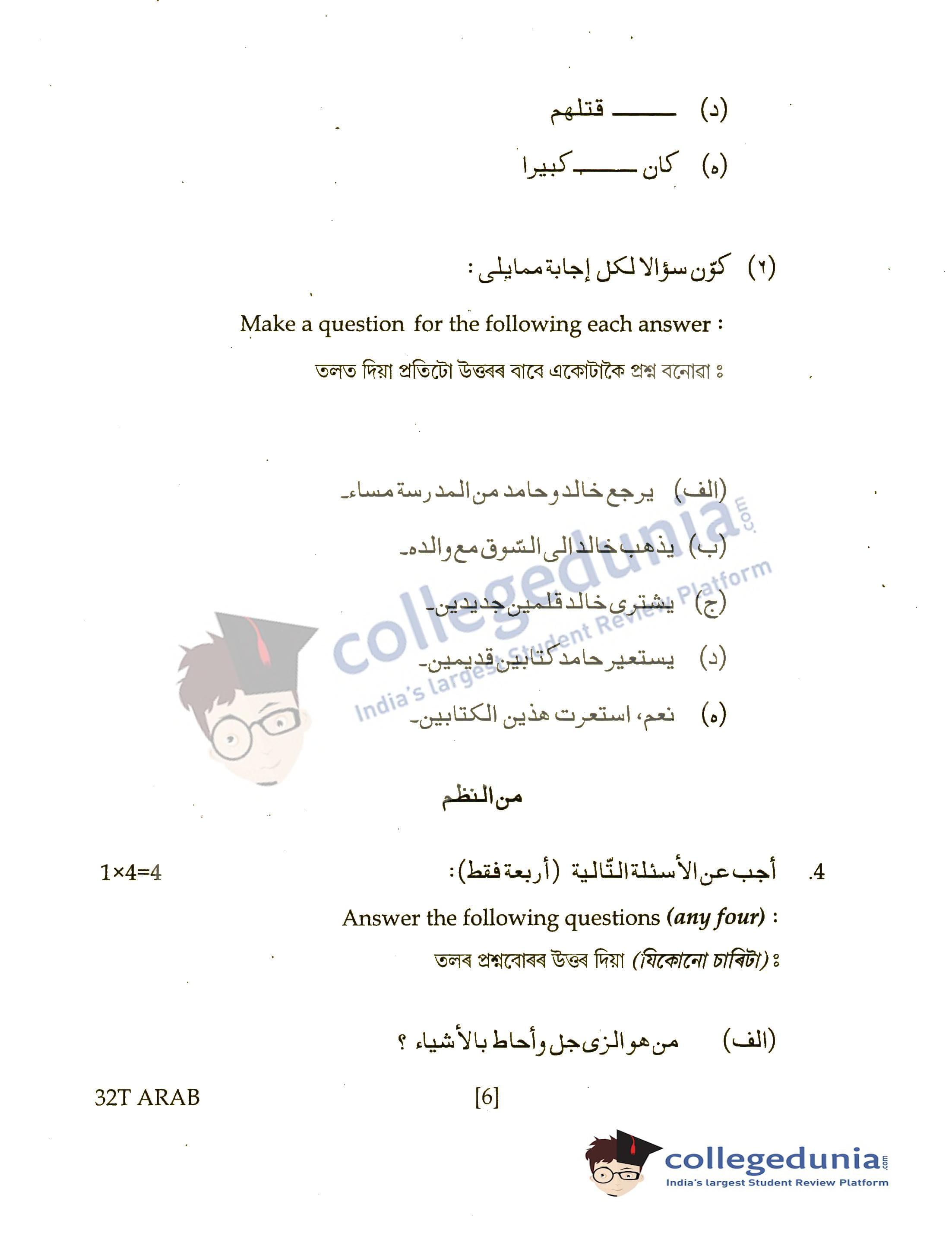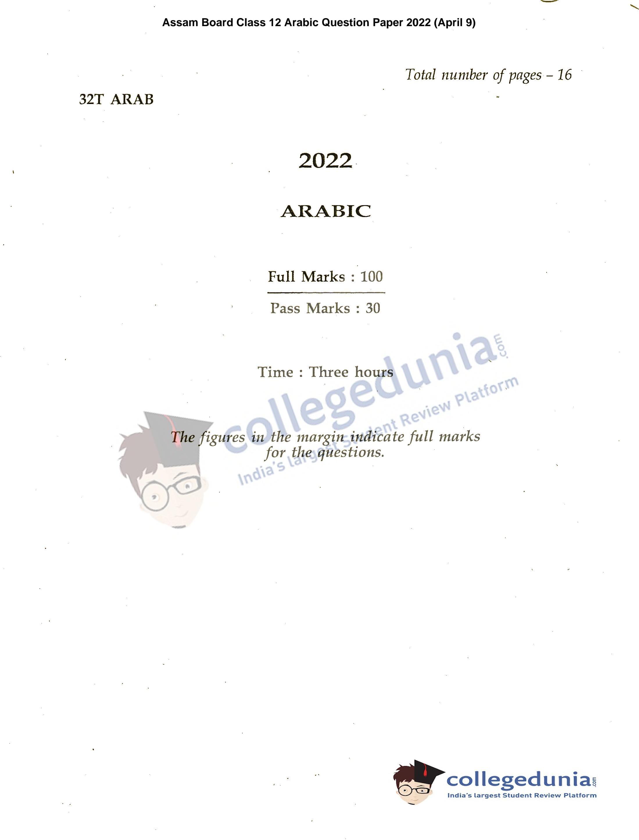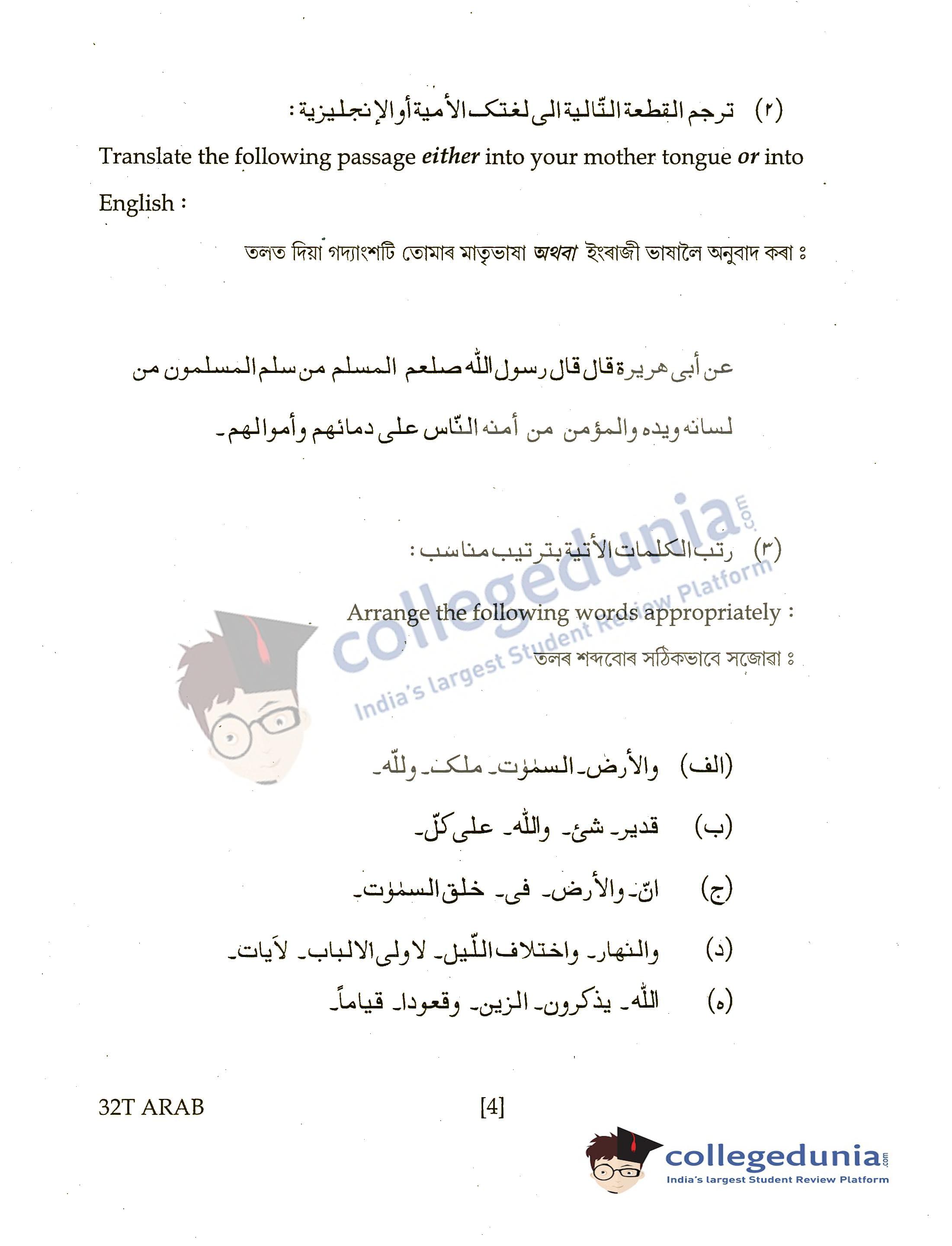 Assam HS 2nd Year Arabic Question Paper 2022 with Answer Key (April 9)