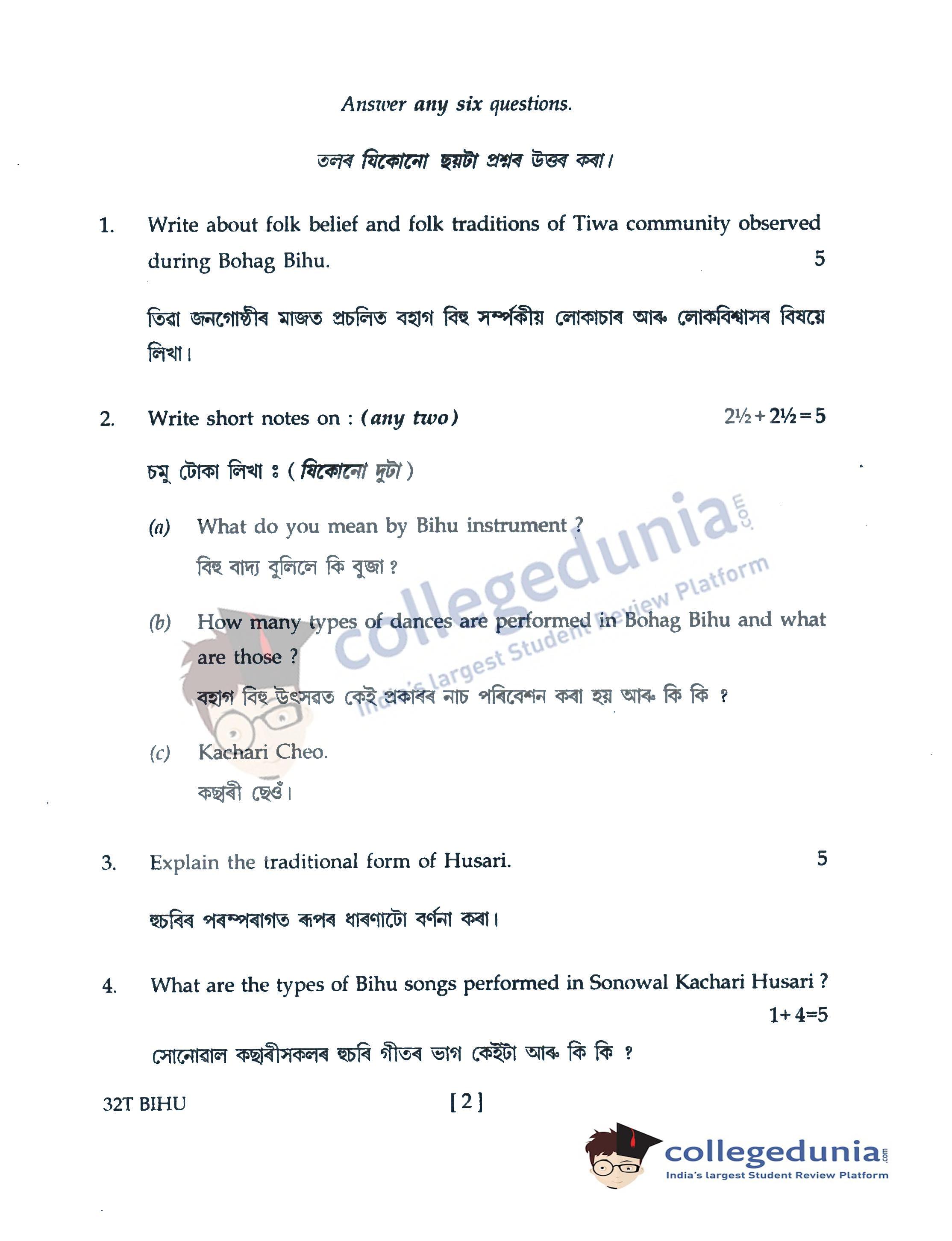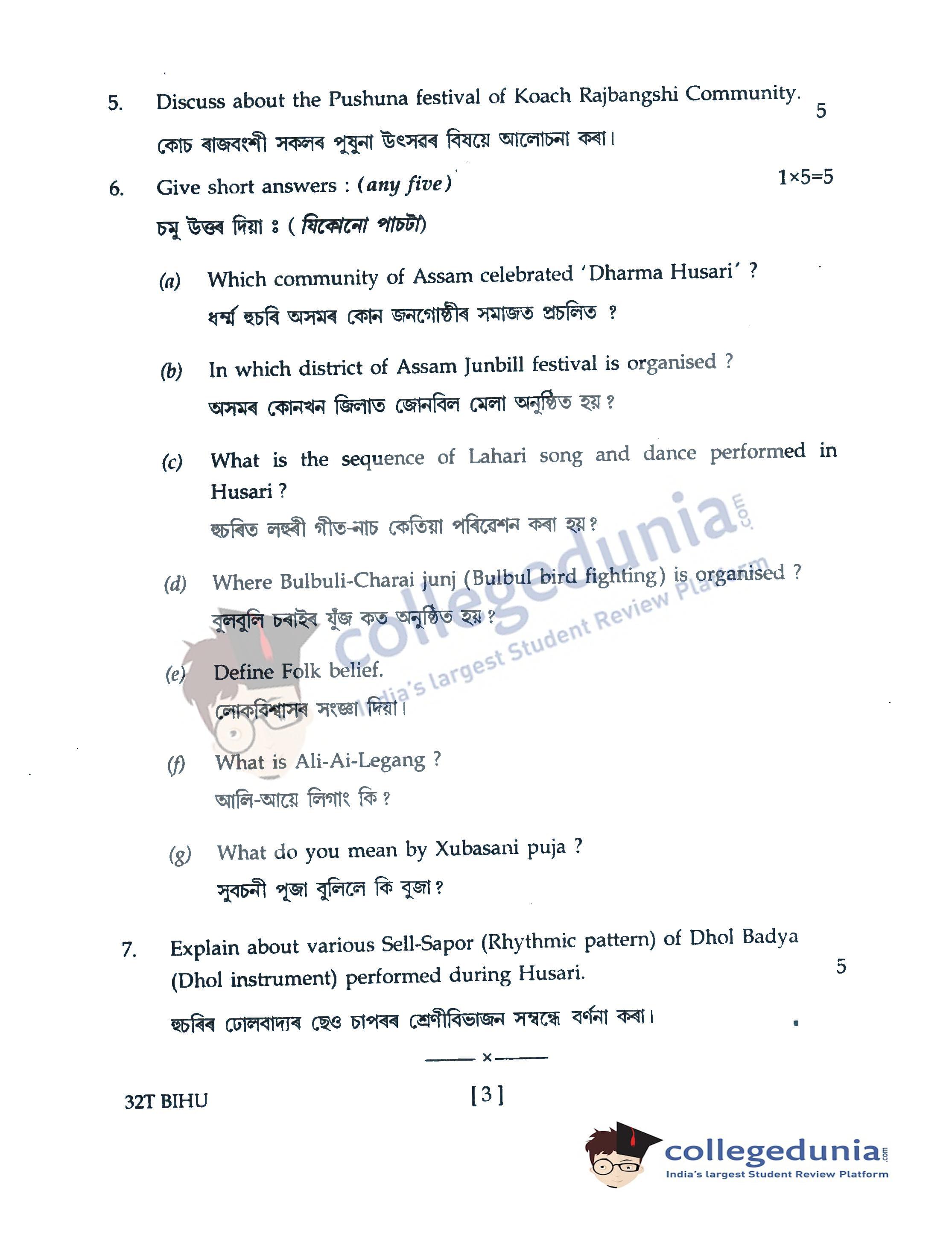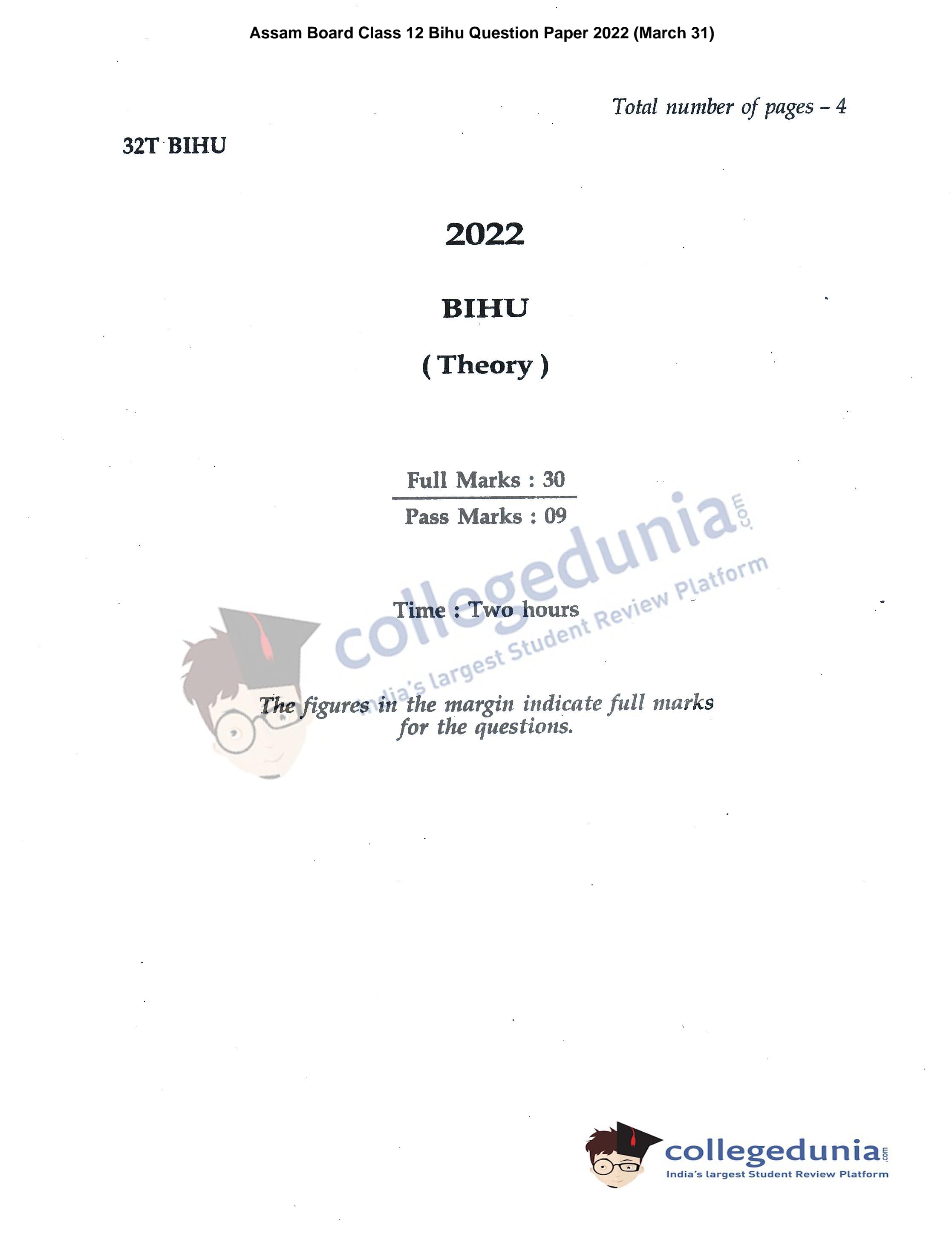 Assam HS 2nd Year Bihu Question Paper 2022 with Answer Key (March 31)