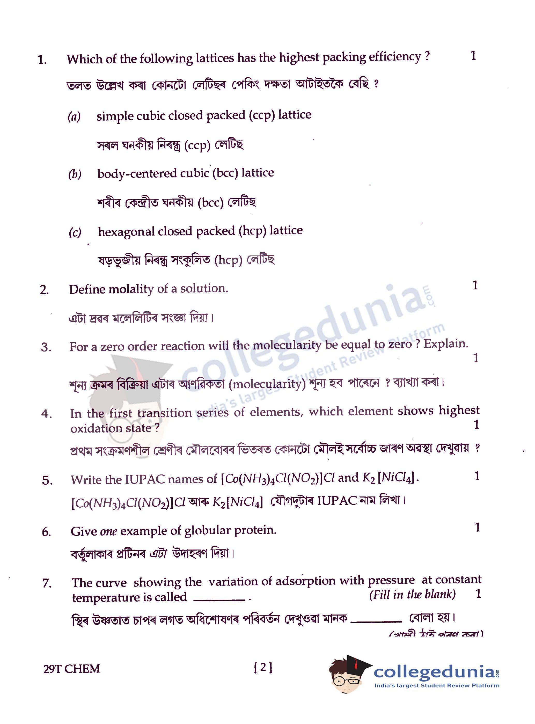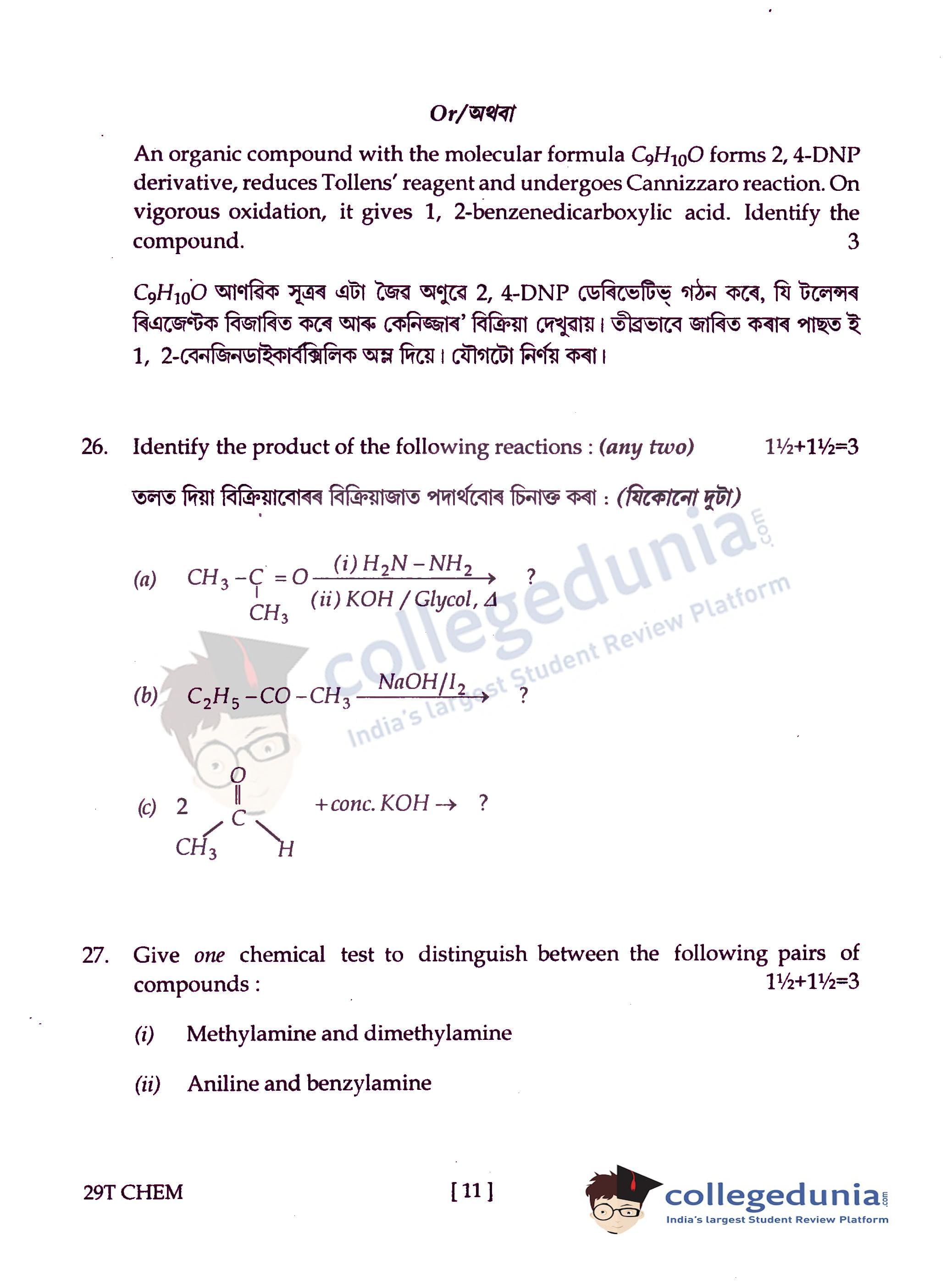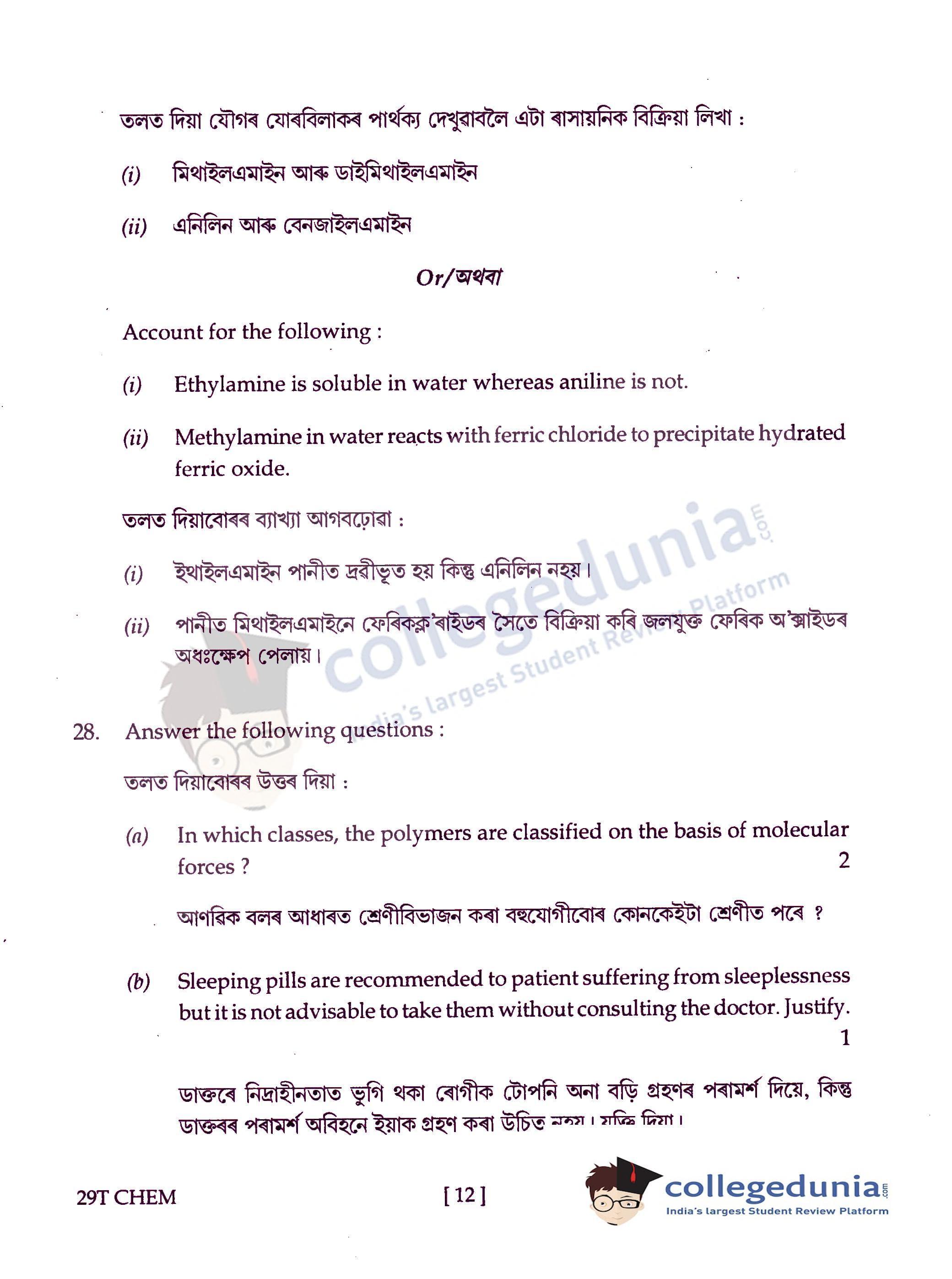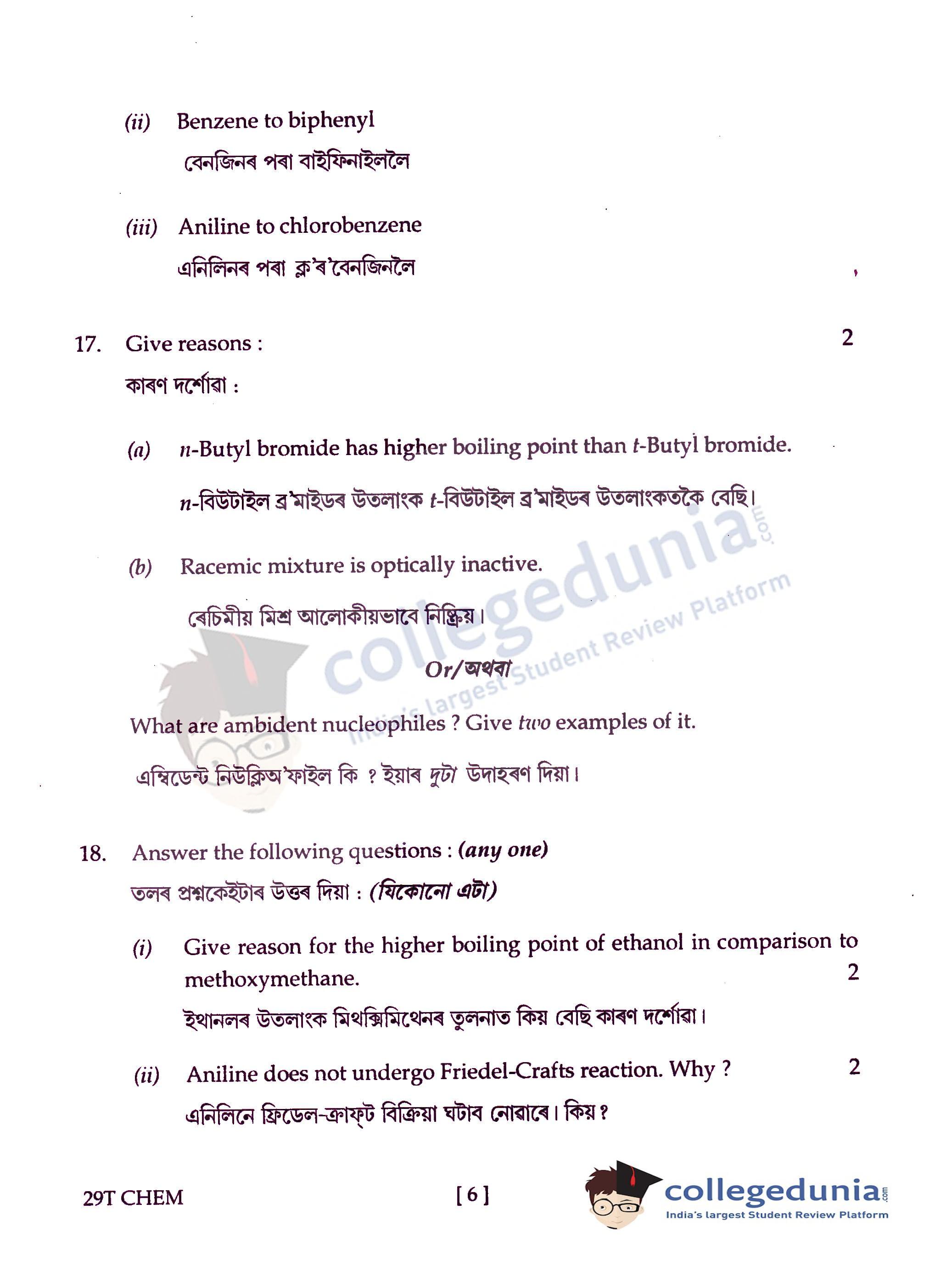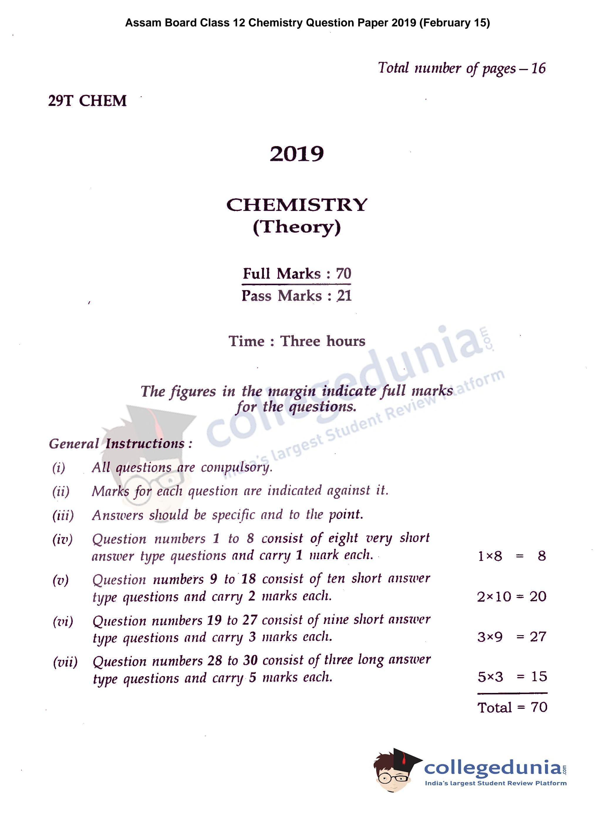 Assam HS 2nd Year Chemistry Question Paper 2019 with Answer Key (February 15)