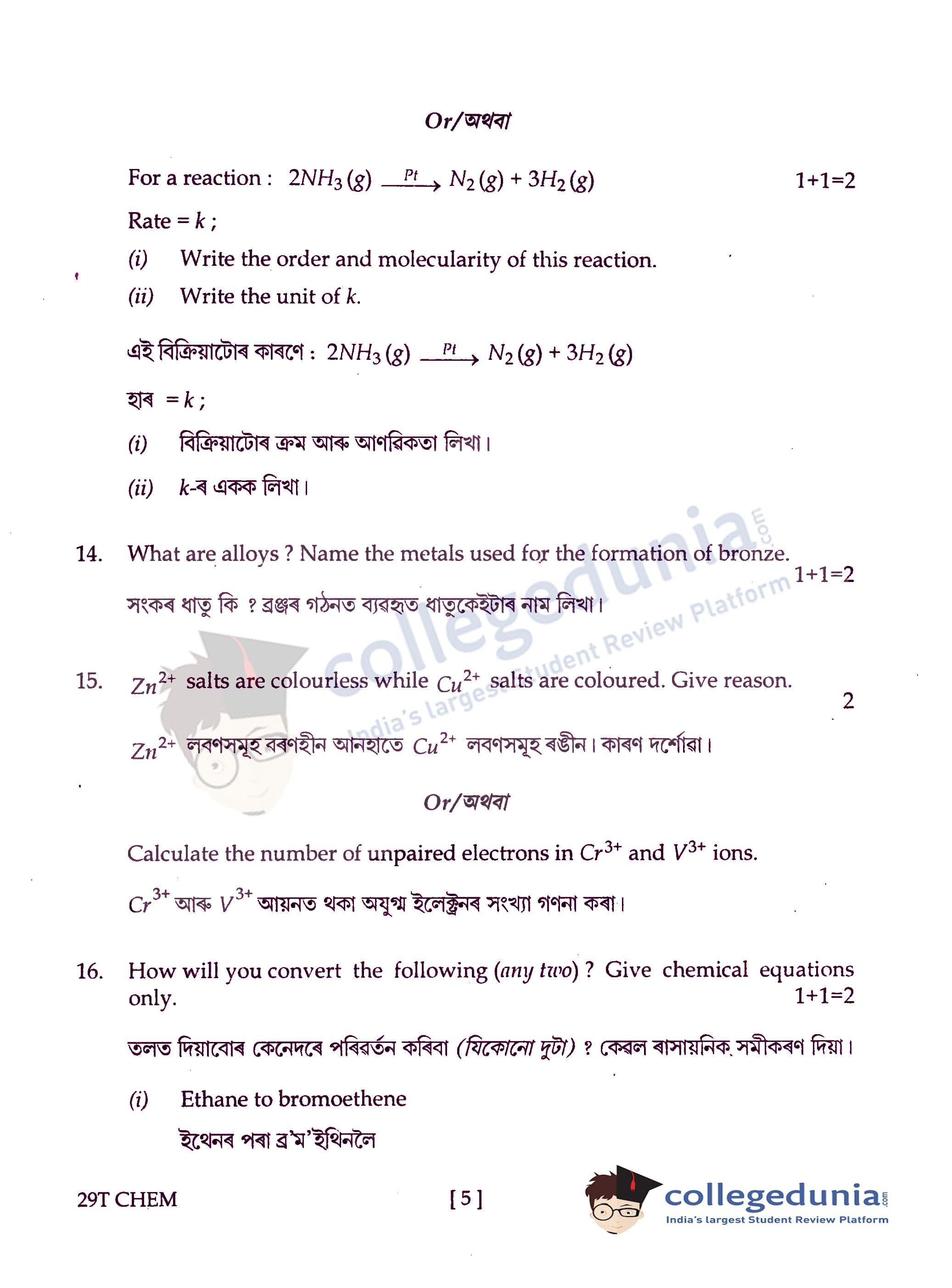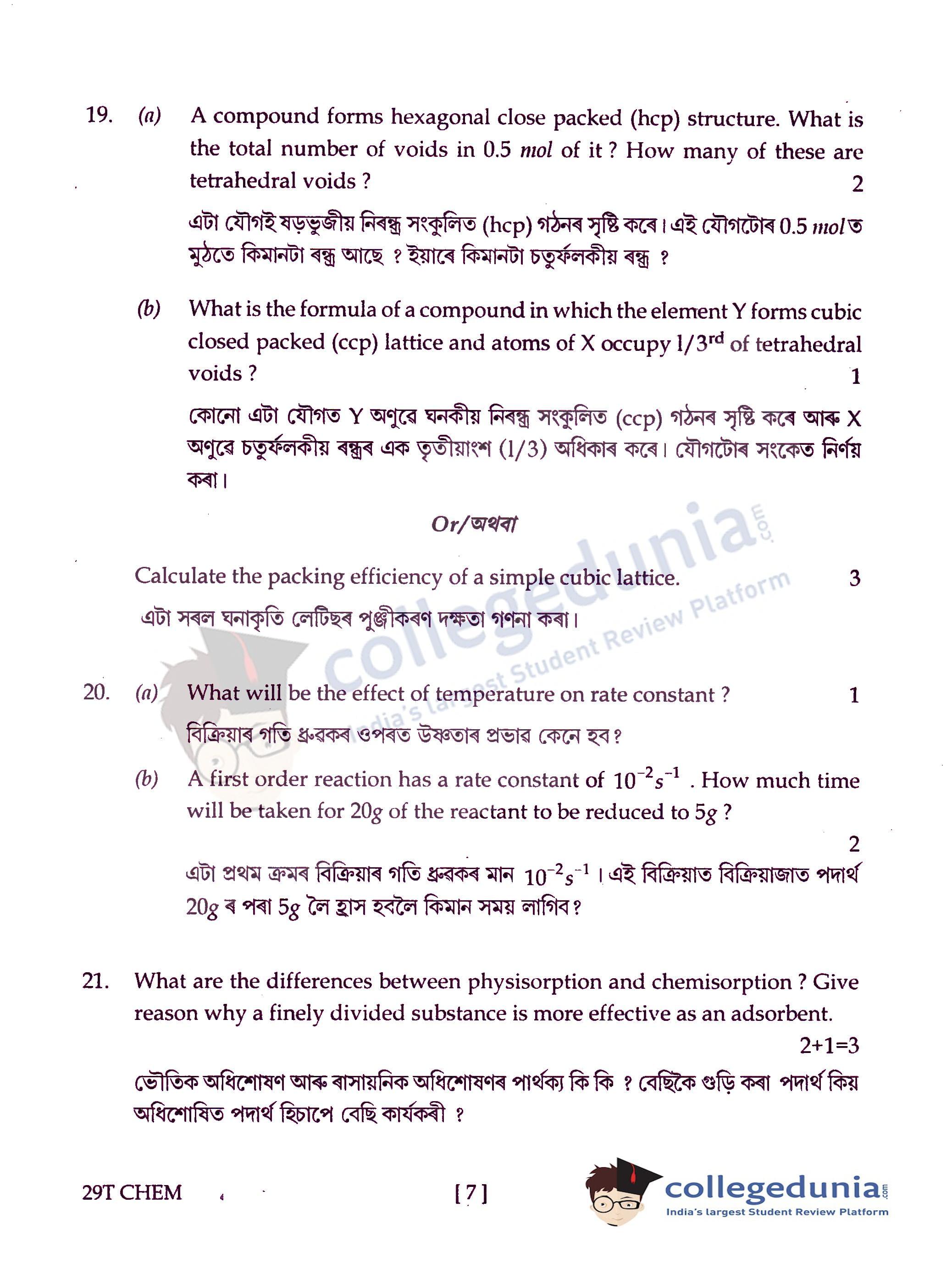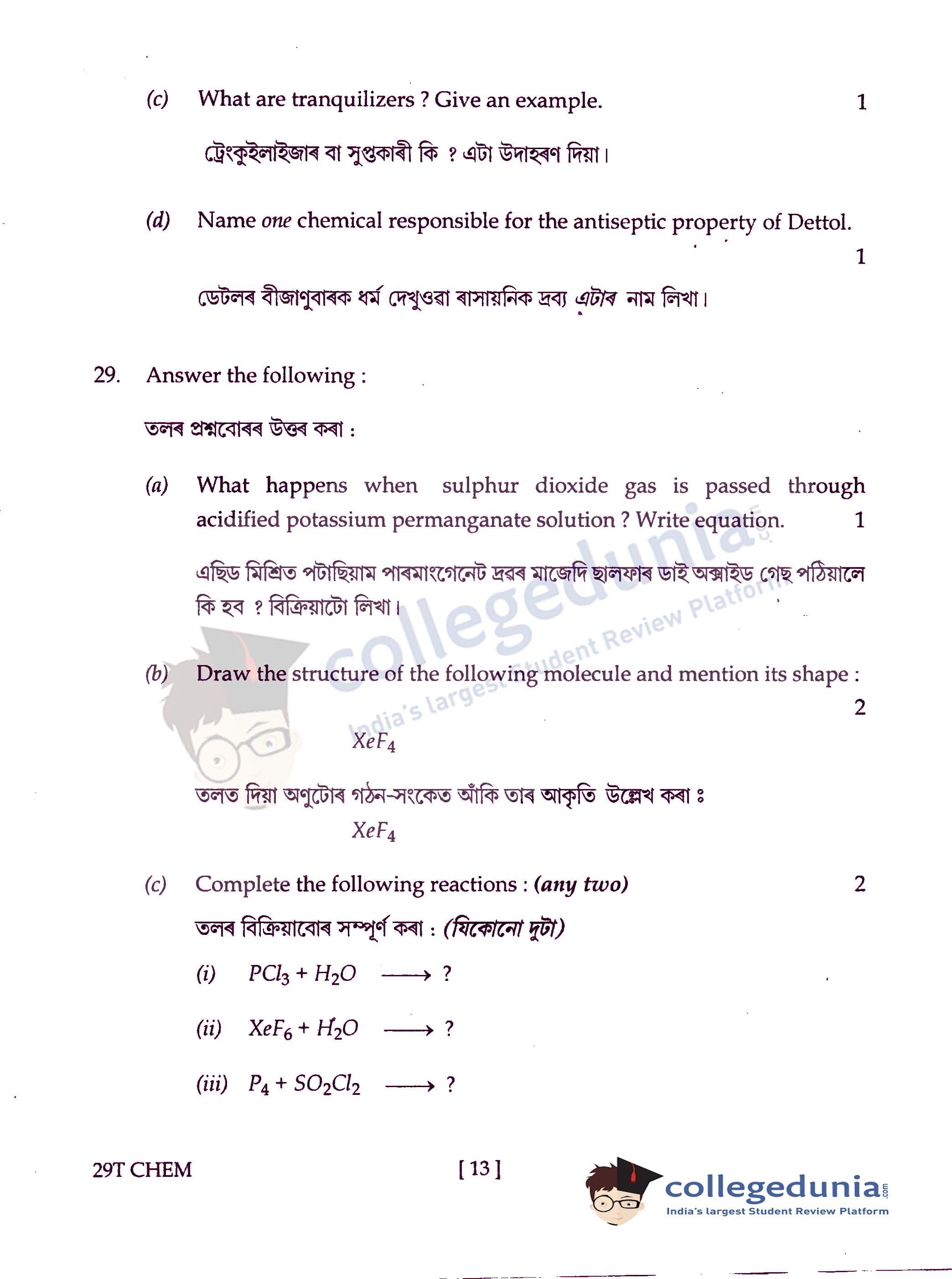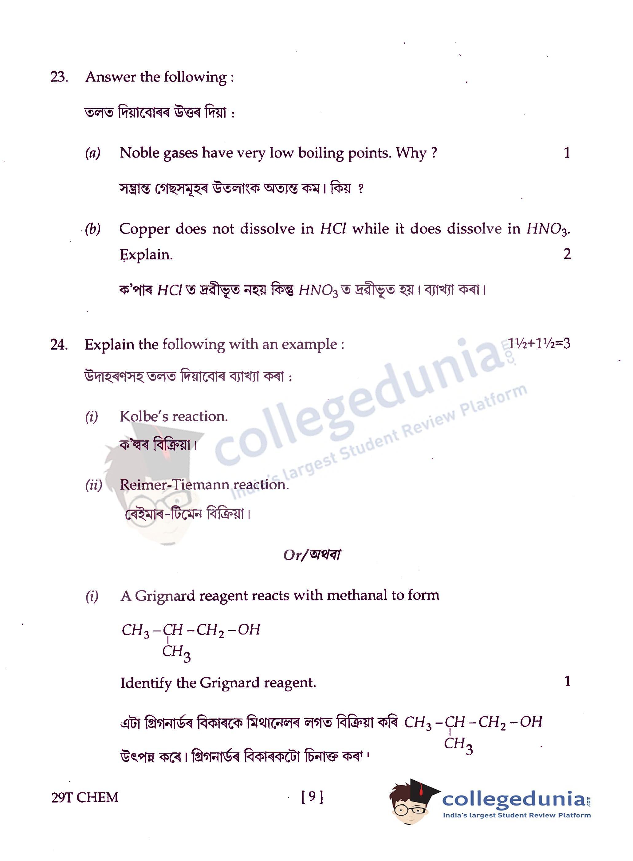 Assam HS 2nd Year Chemistry Question Paper 2019 with Answer Key (February 15)