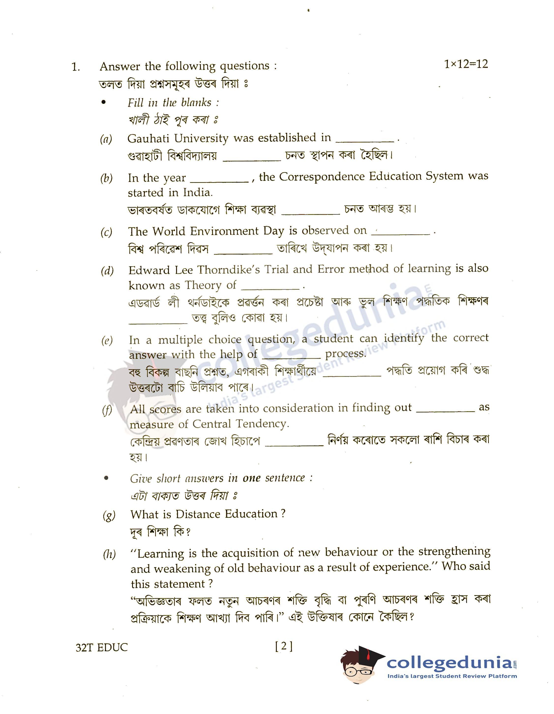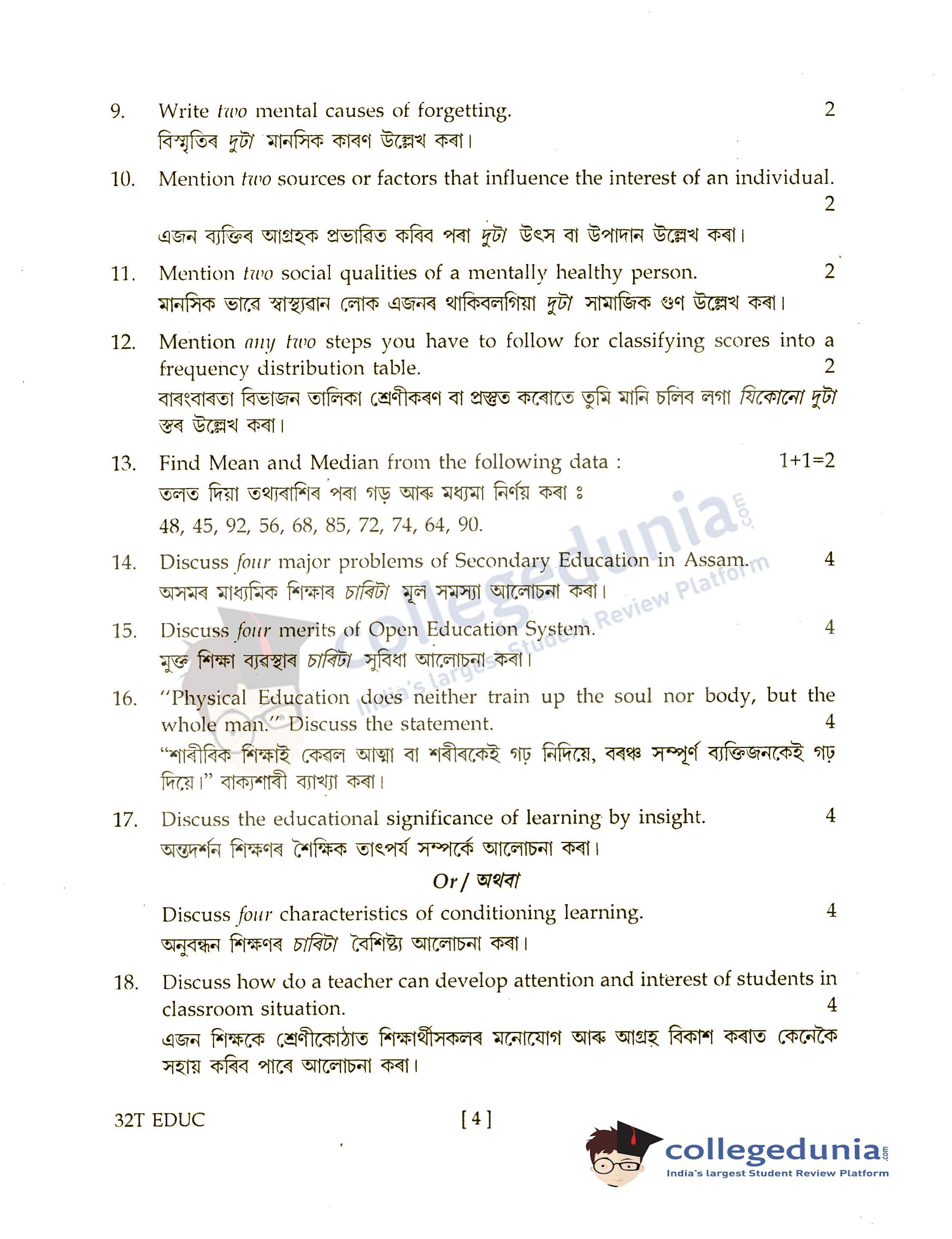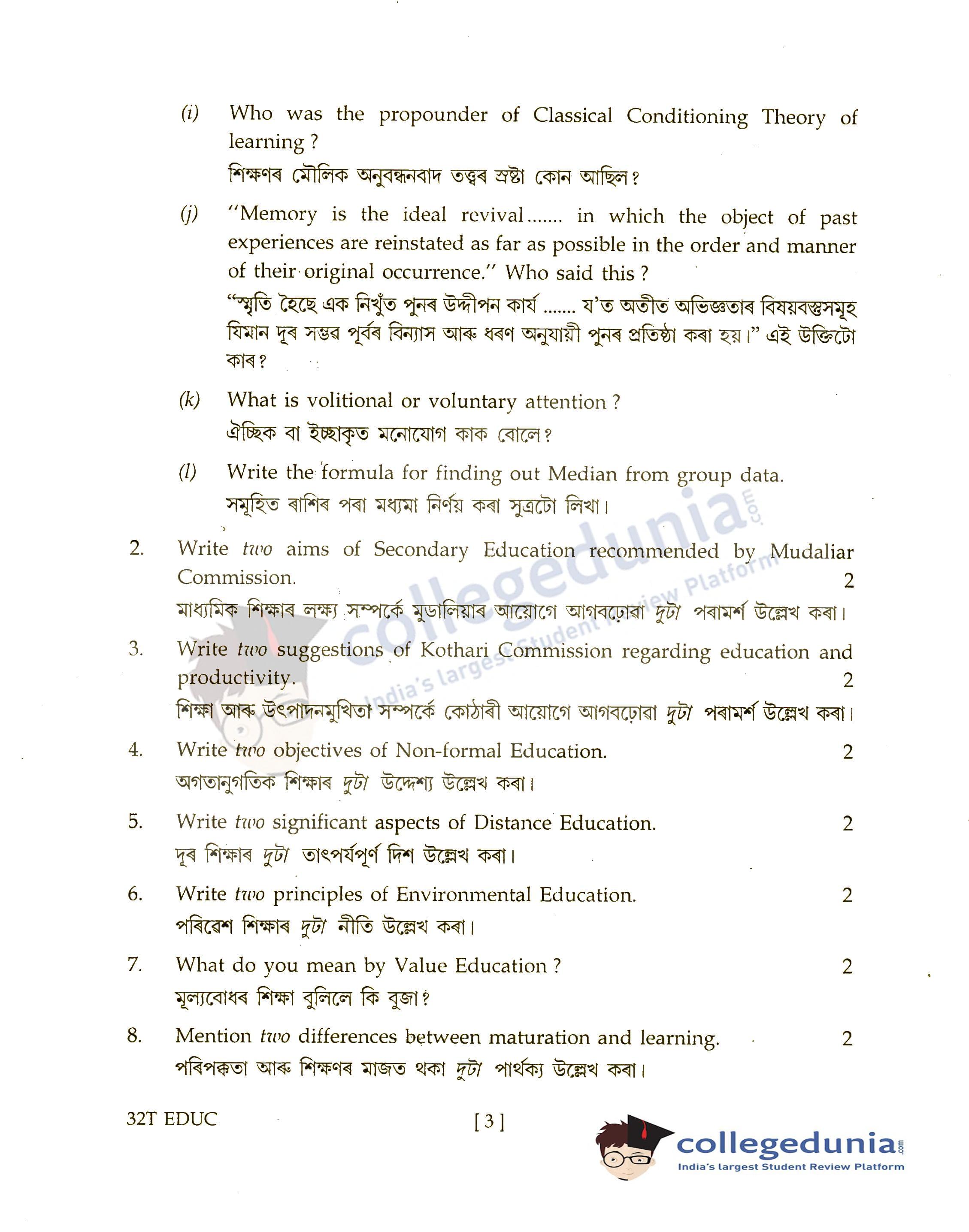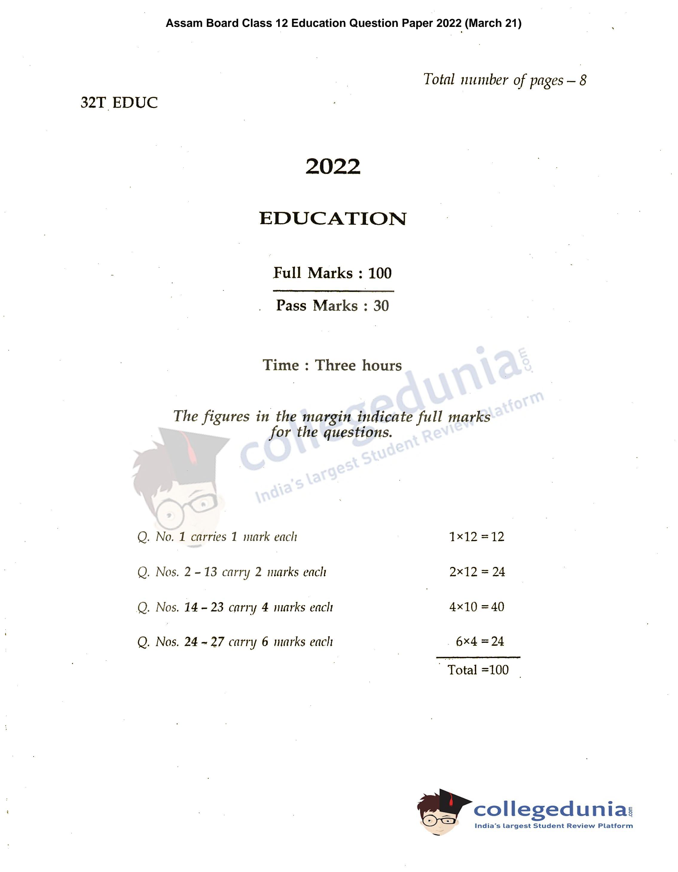 Assam HS 2nd Year Education Question Paper 2022 with Answer Key (March 21)