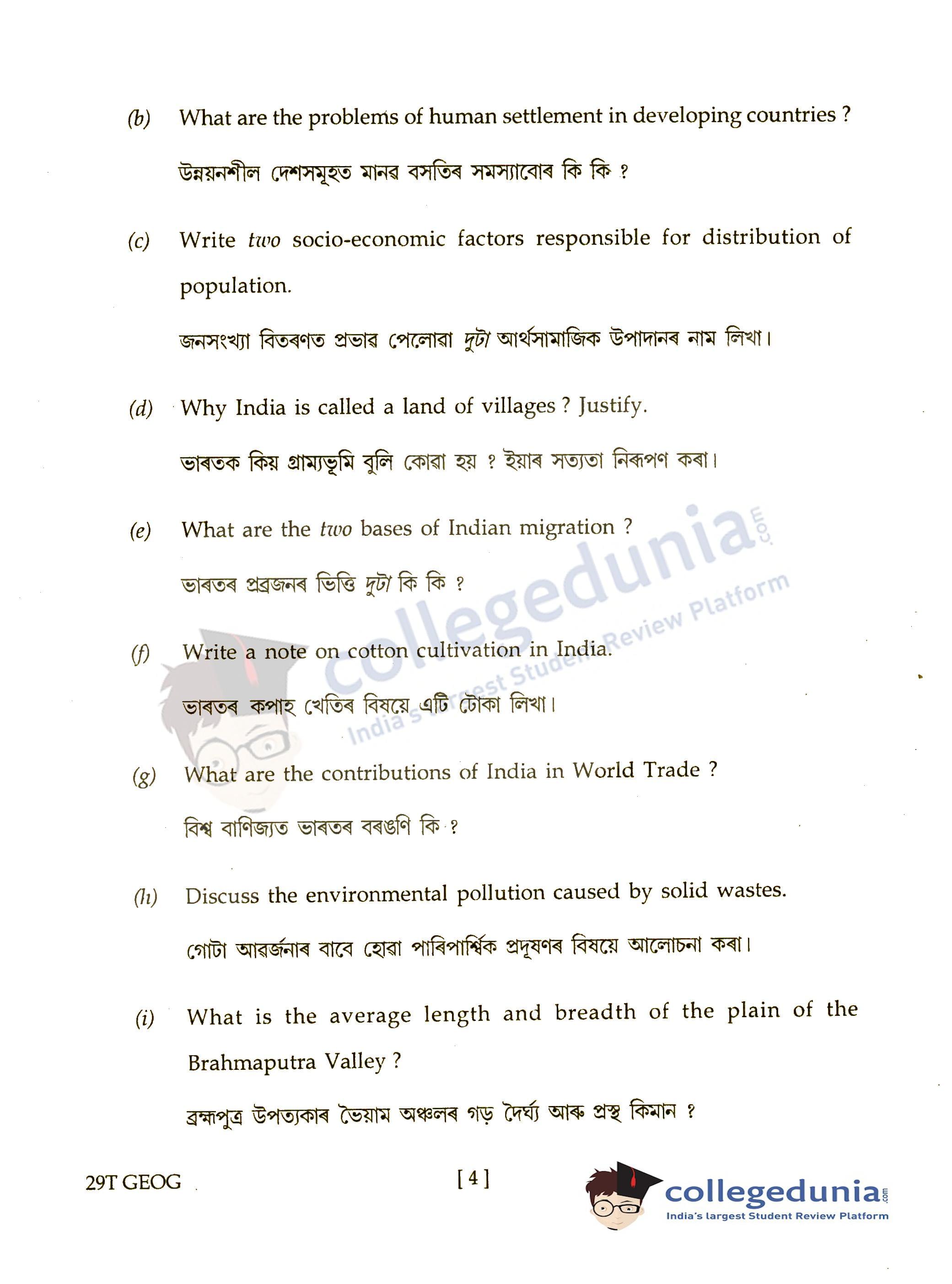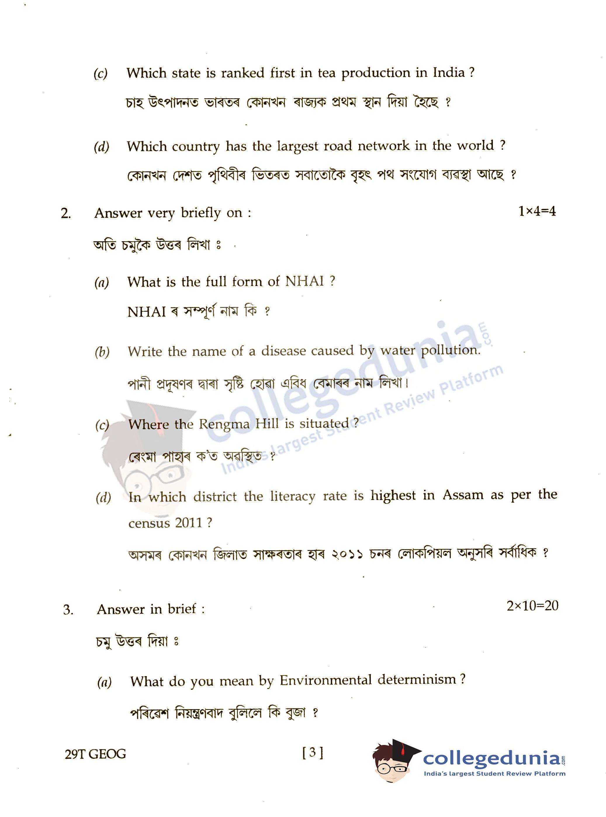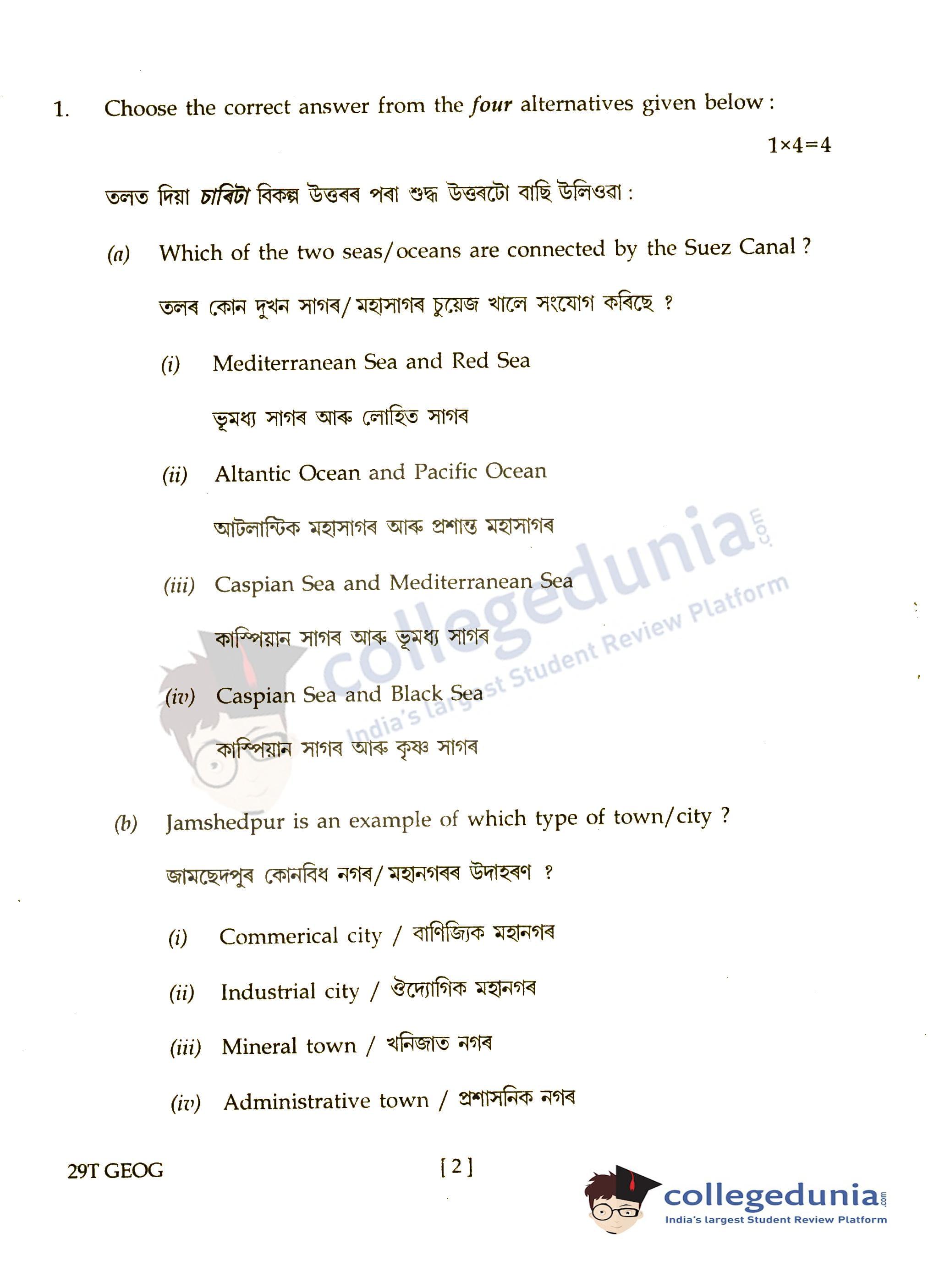 Assam HS 2nd Year Geography Question Paper 2019 with Answer Key (March 7)
