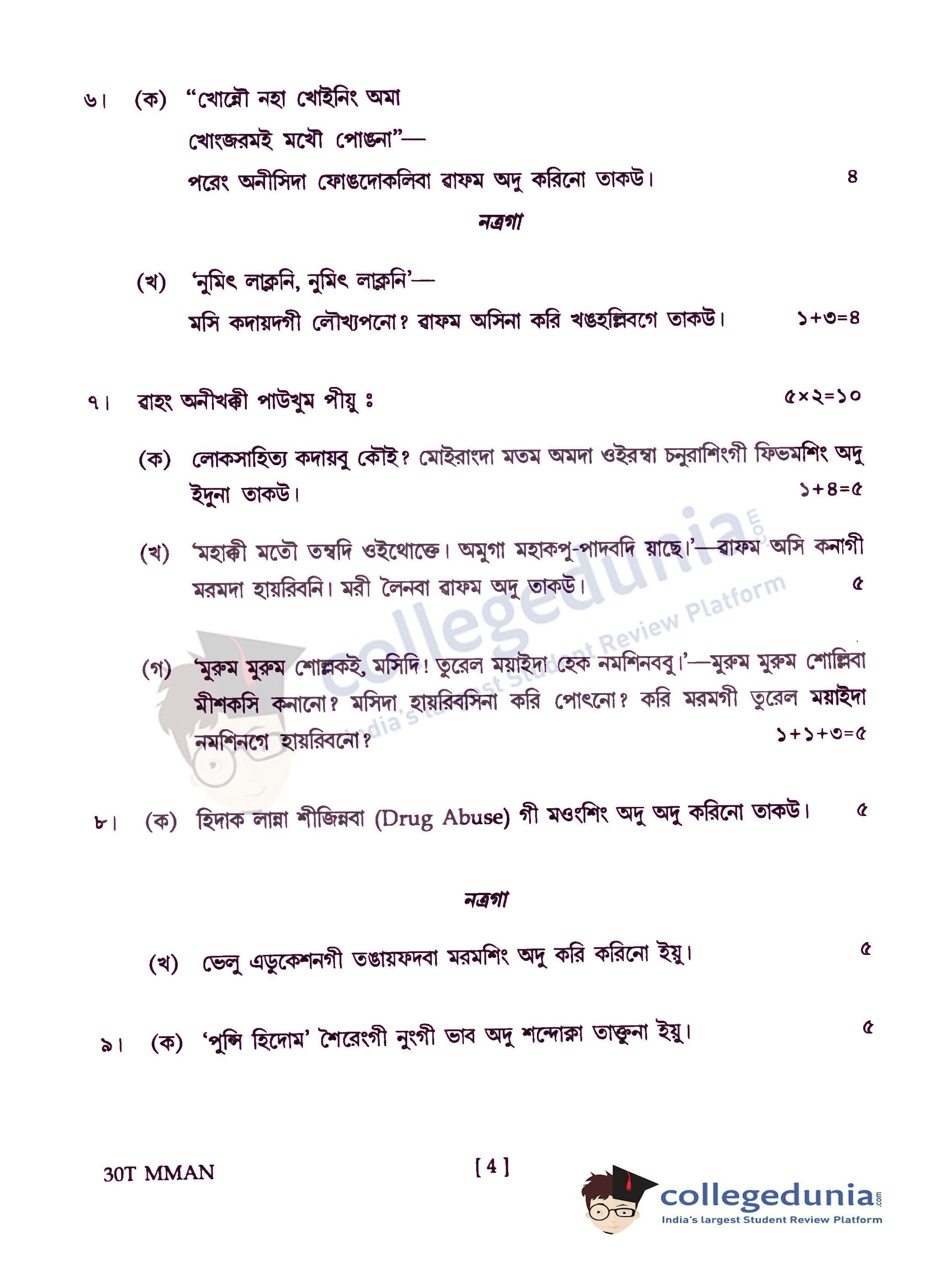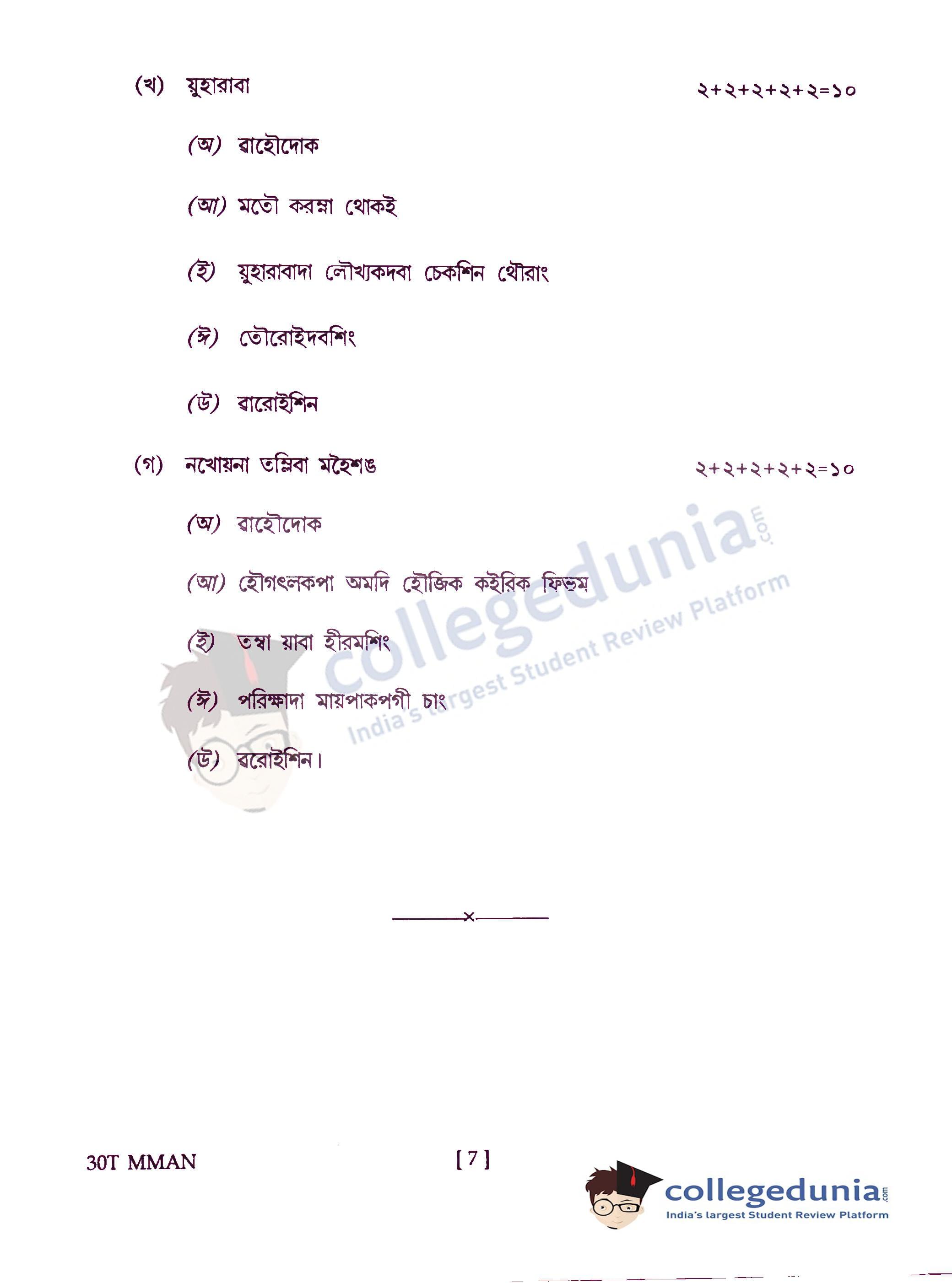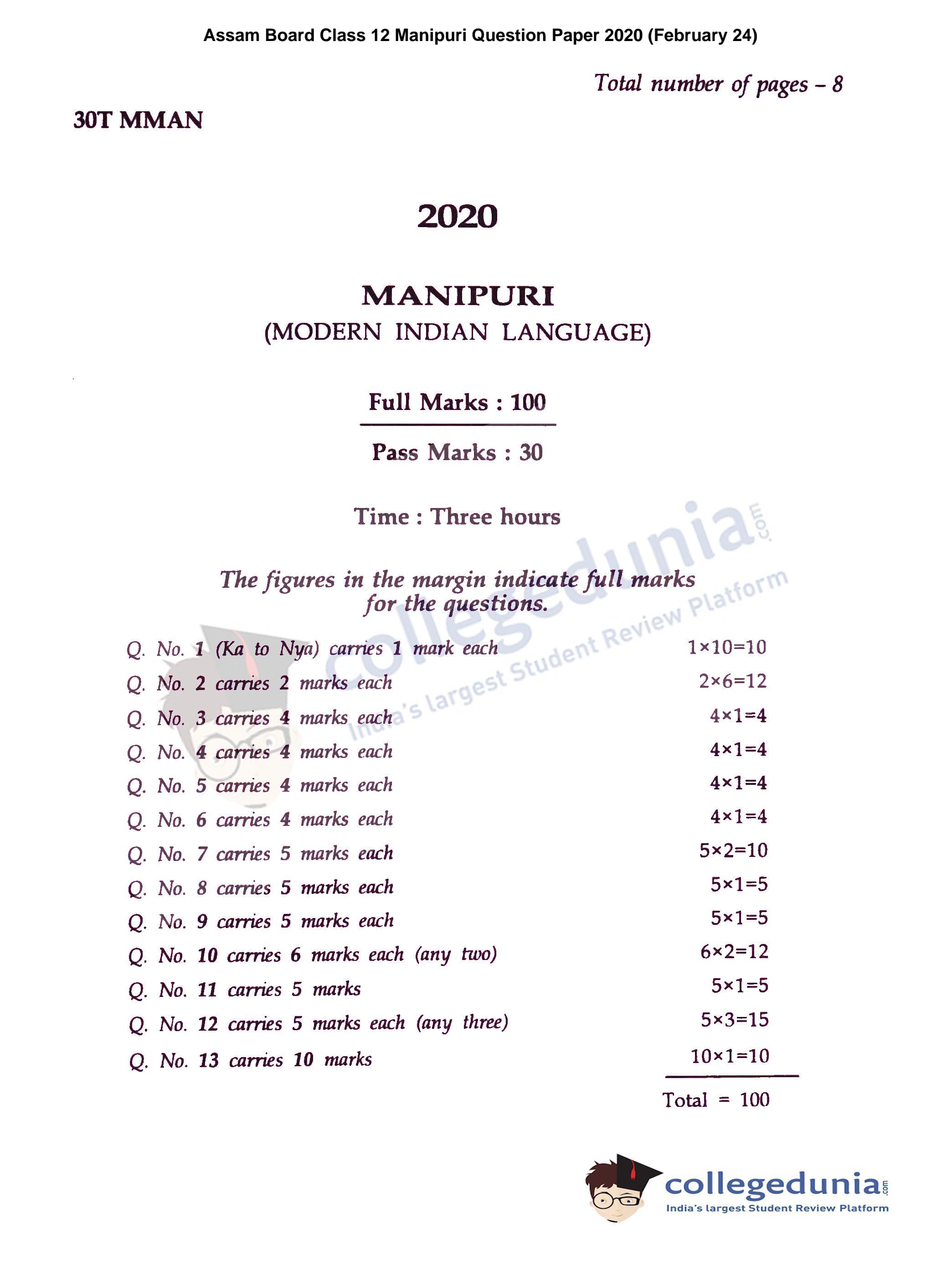 Assam HS 2nd Year Manipuri Question Paper 2020 with Answer Key (February 24)
