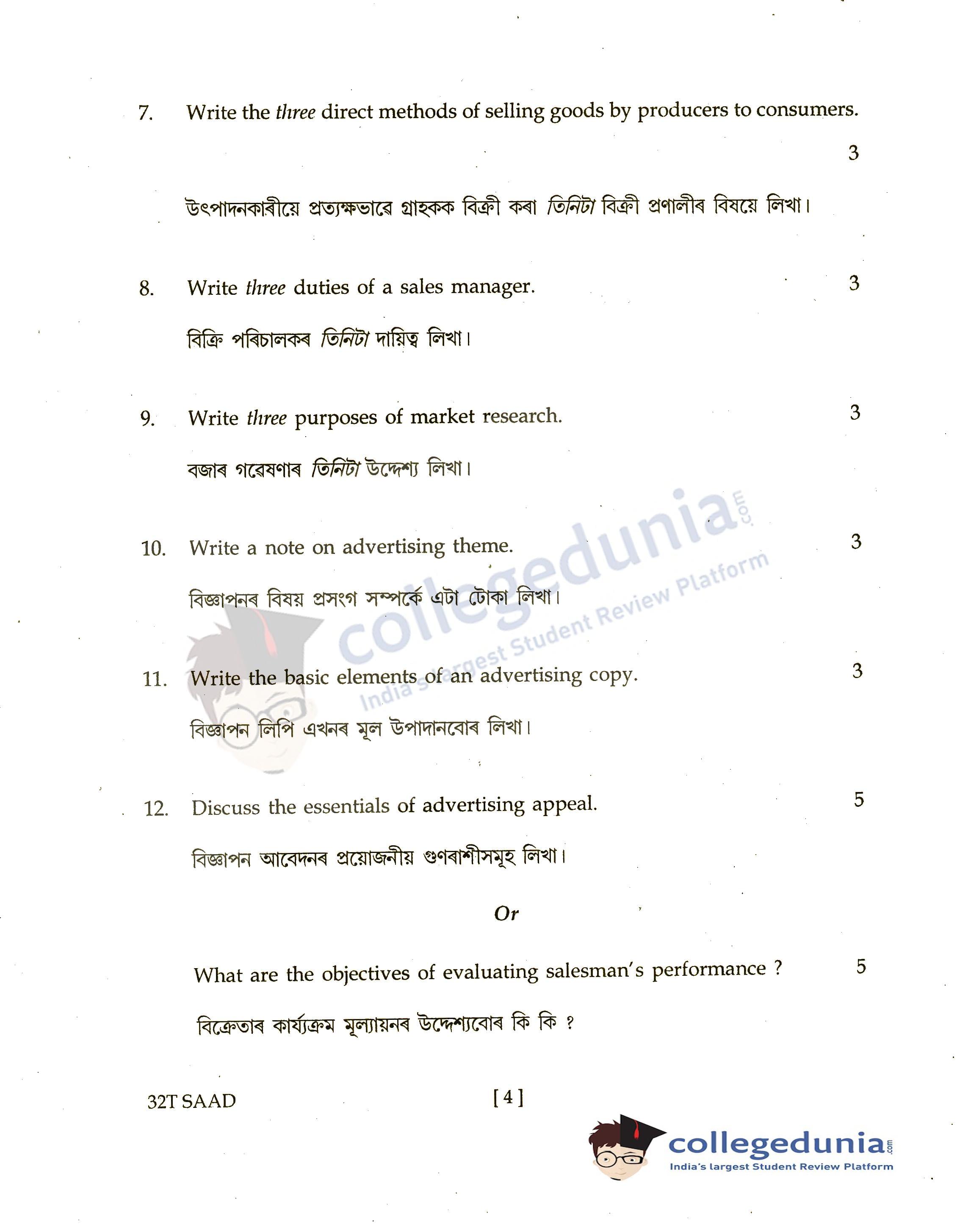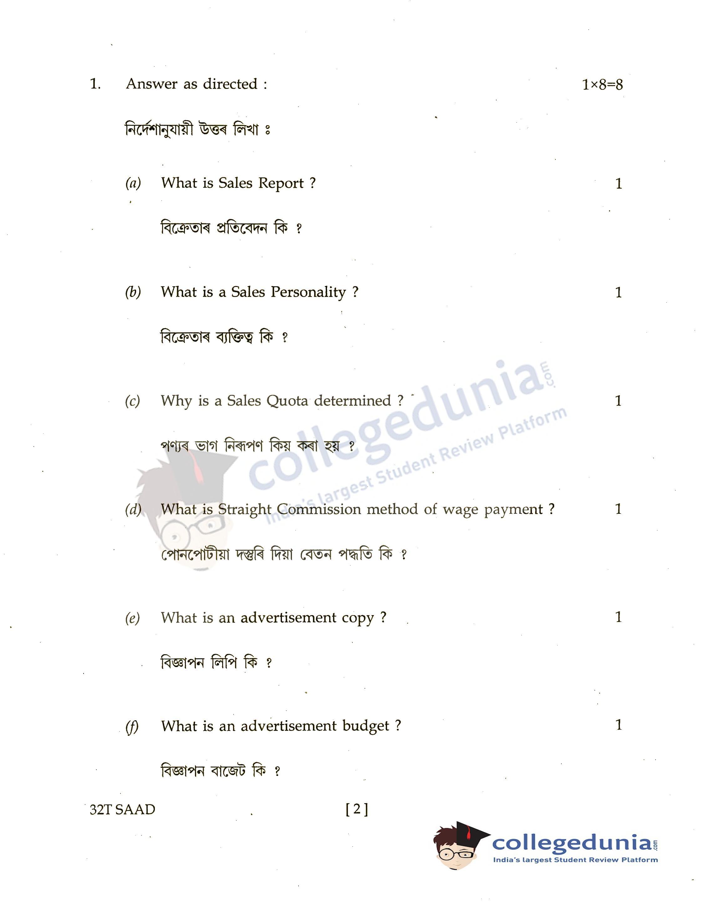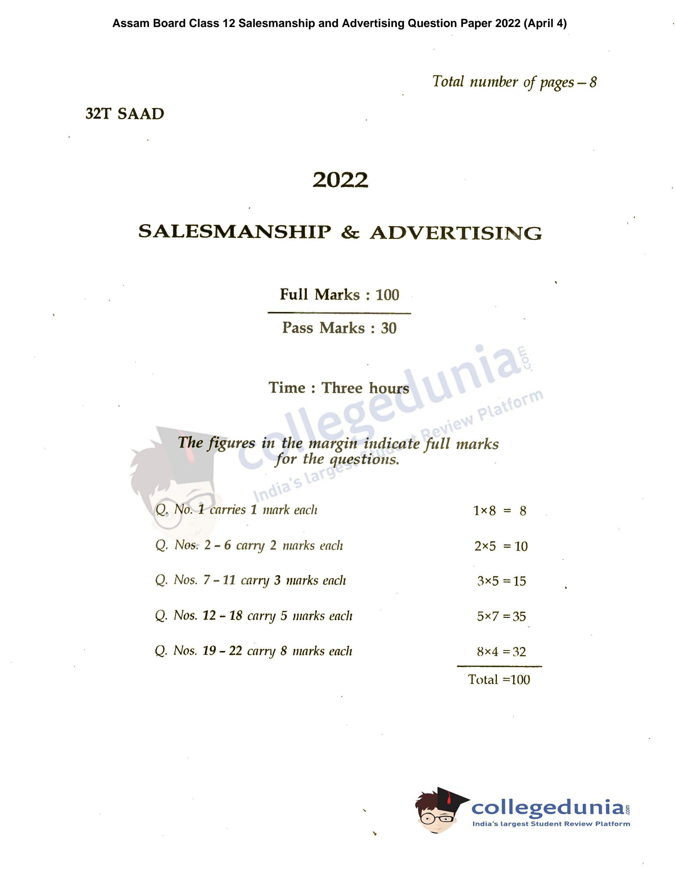 Assam HS 2nd Year Salesmanship and Advertising Question Paper 2022 with Answer Key (April 4)