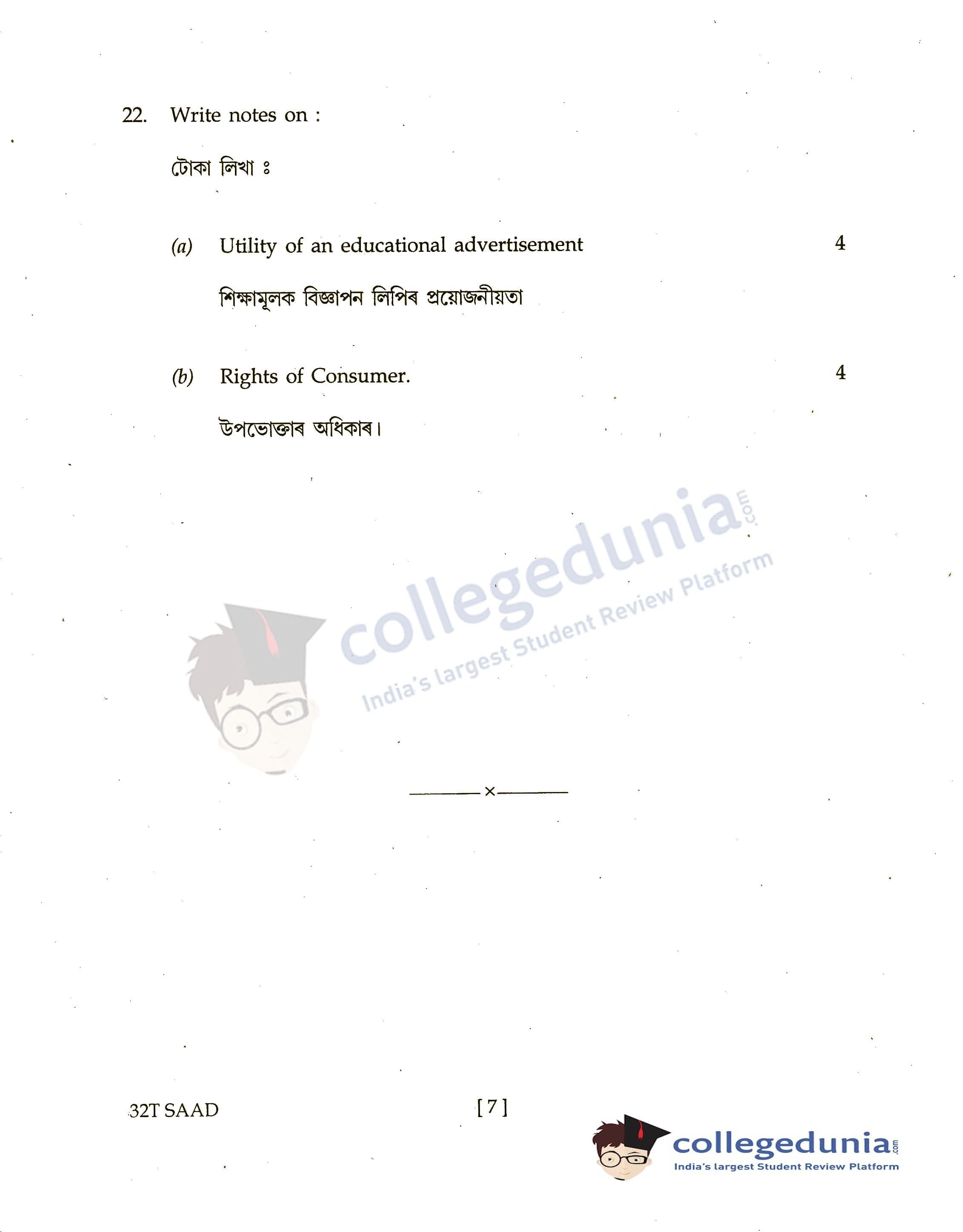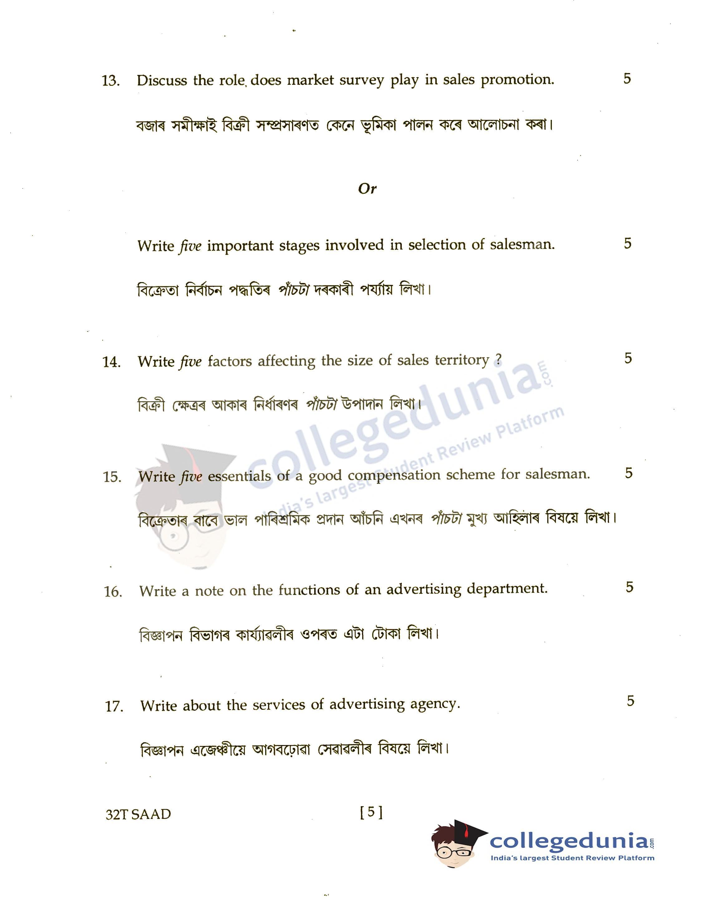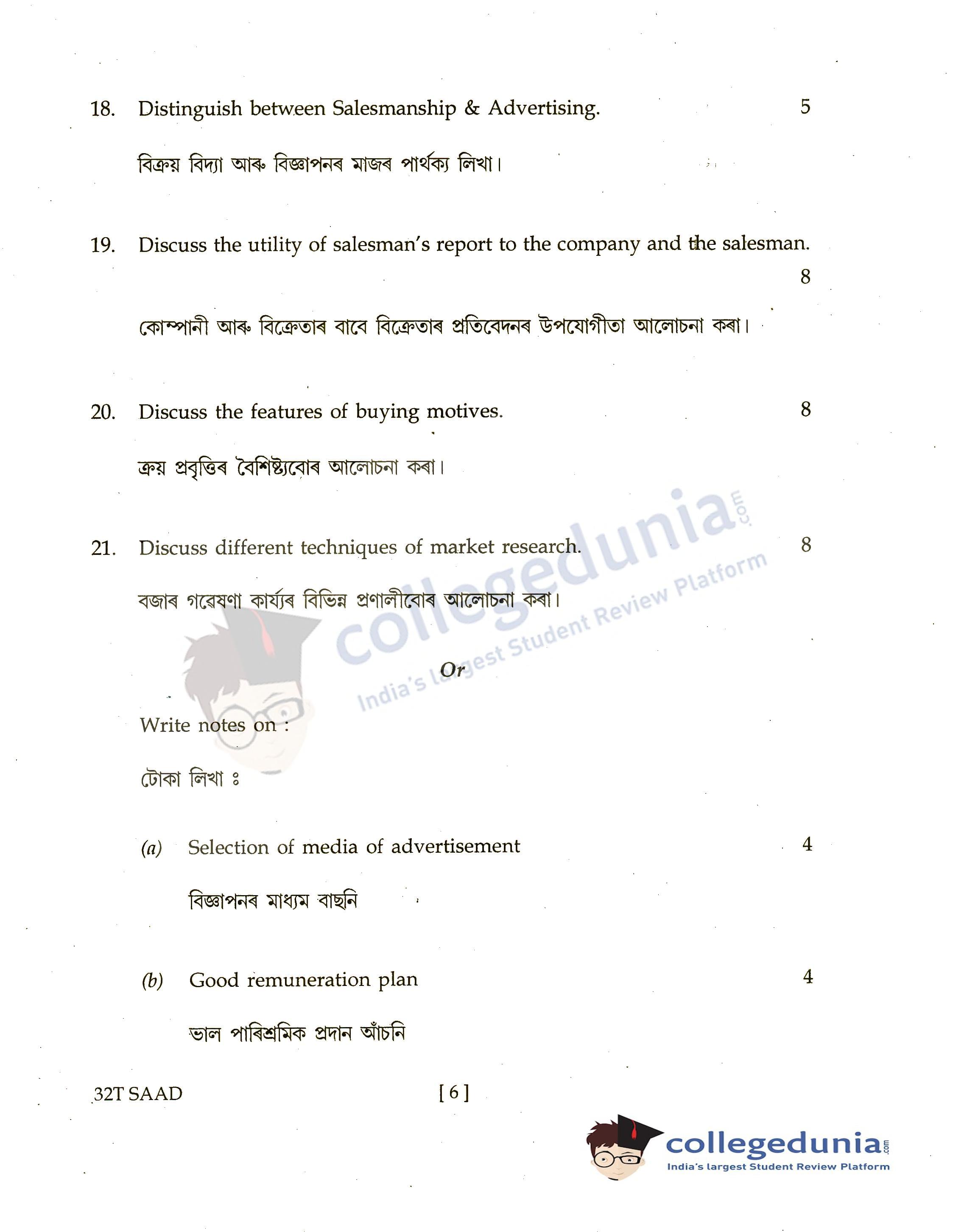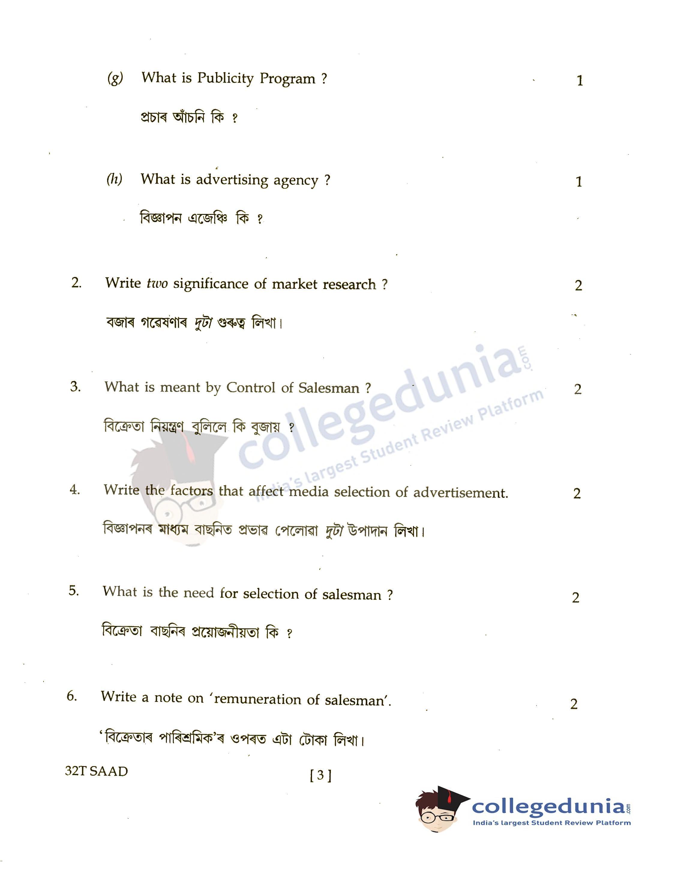 Assam HS 2nd Year Salesmanship and Advertising Question Paper 2022 with Answer Key (April 4)