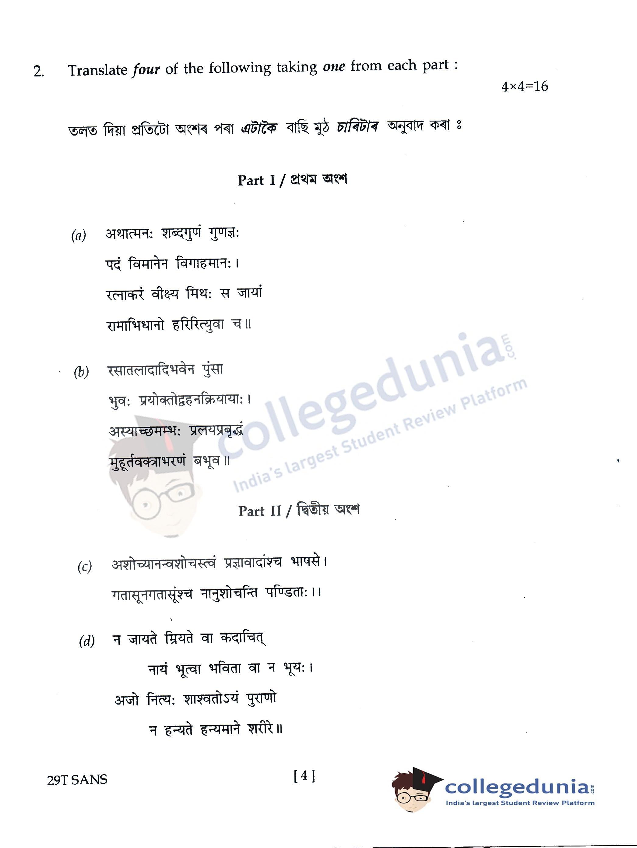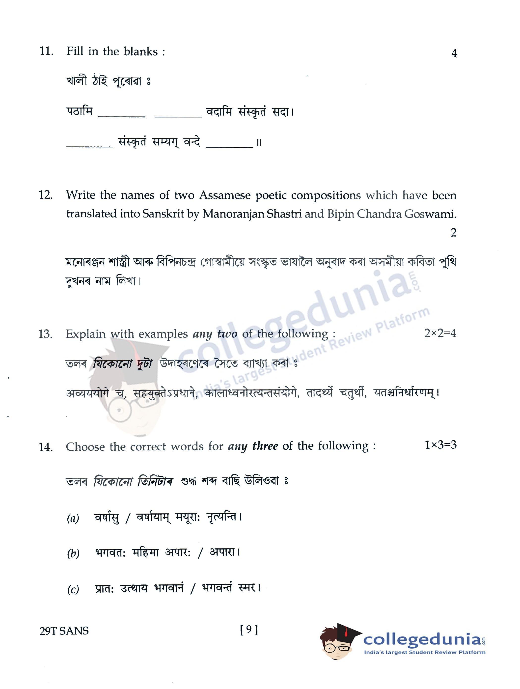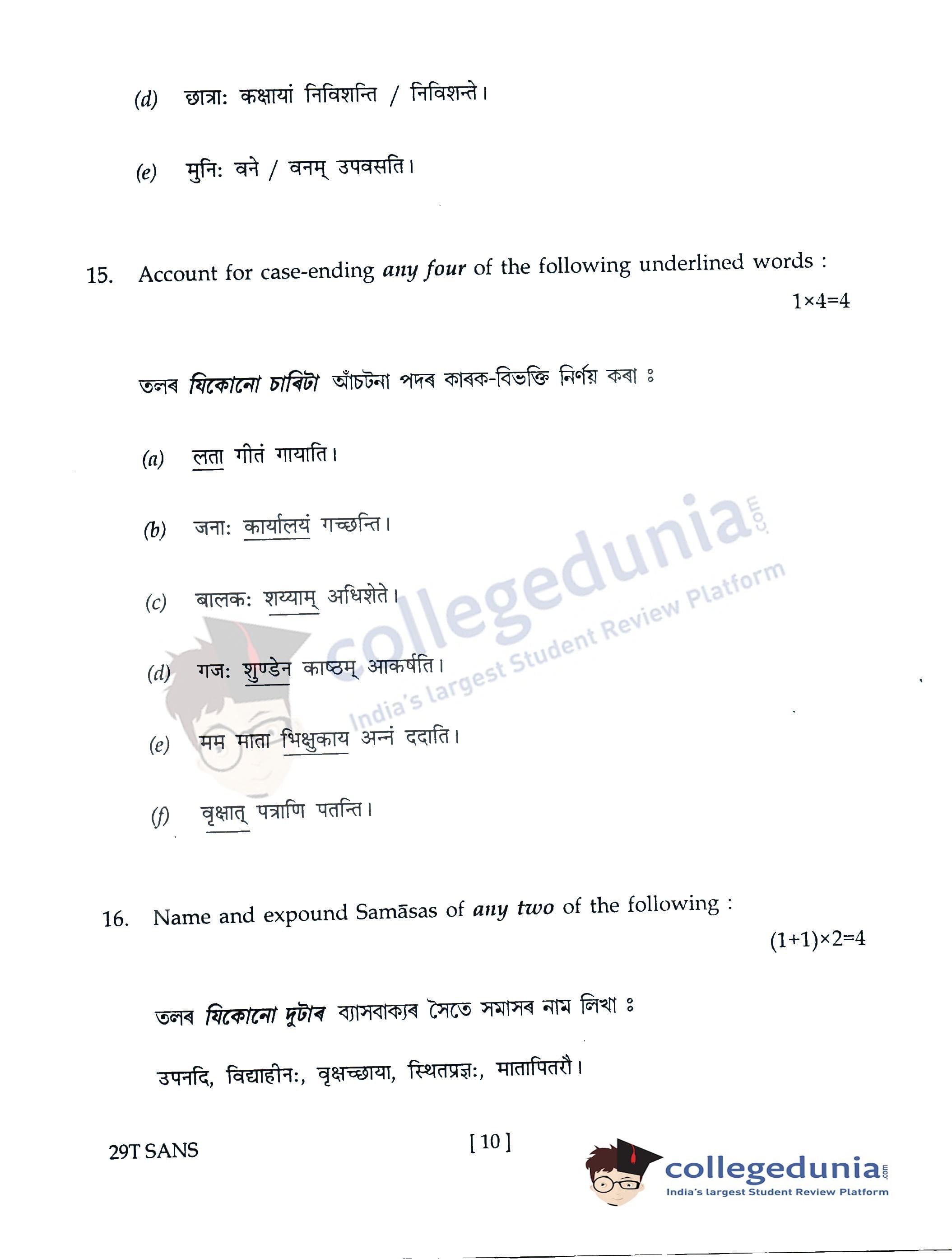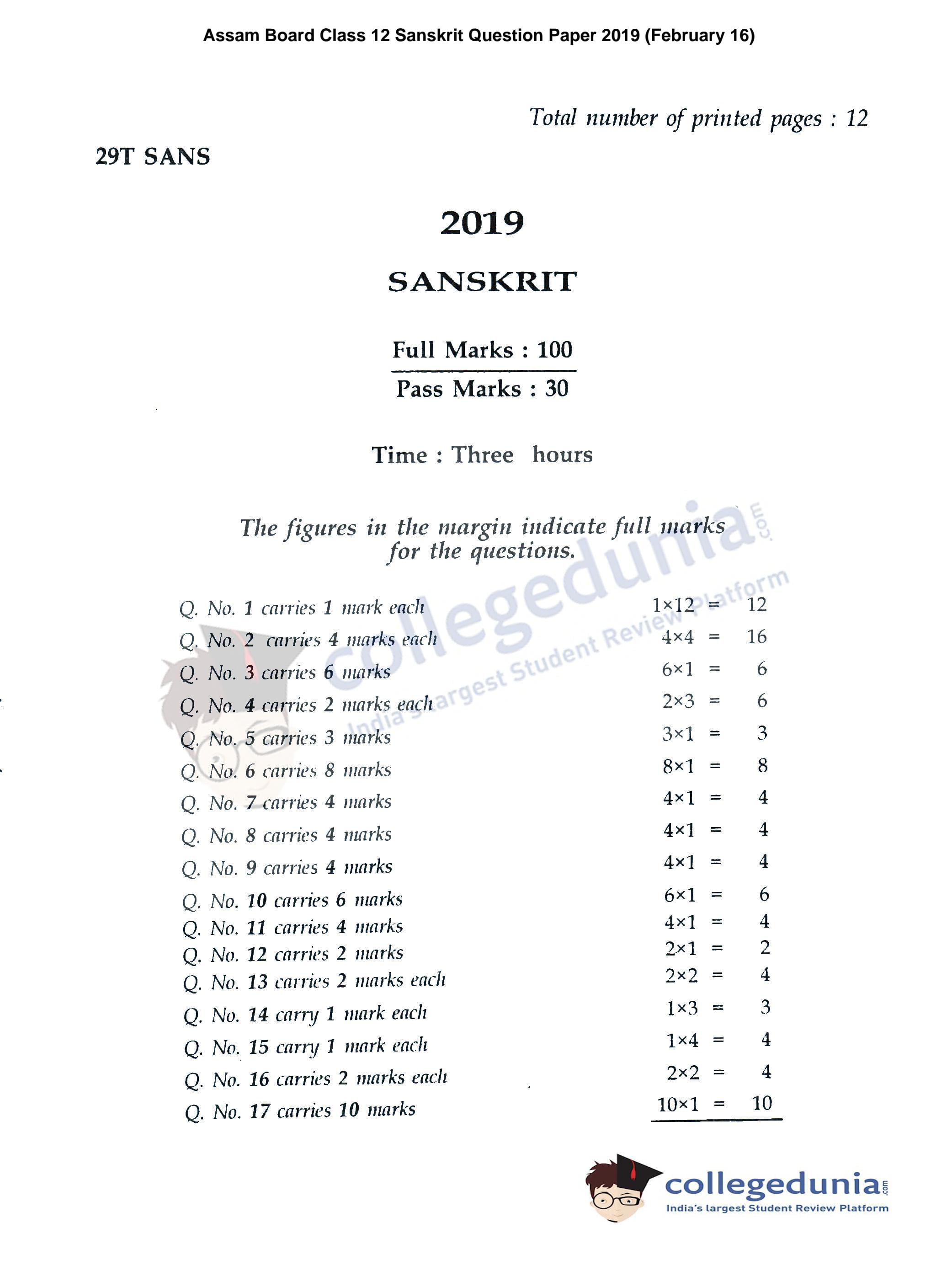 Assam HS 2nd Year Sanskrit Question Paper 2019 with Answer Key (February 16)