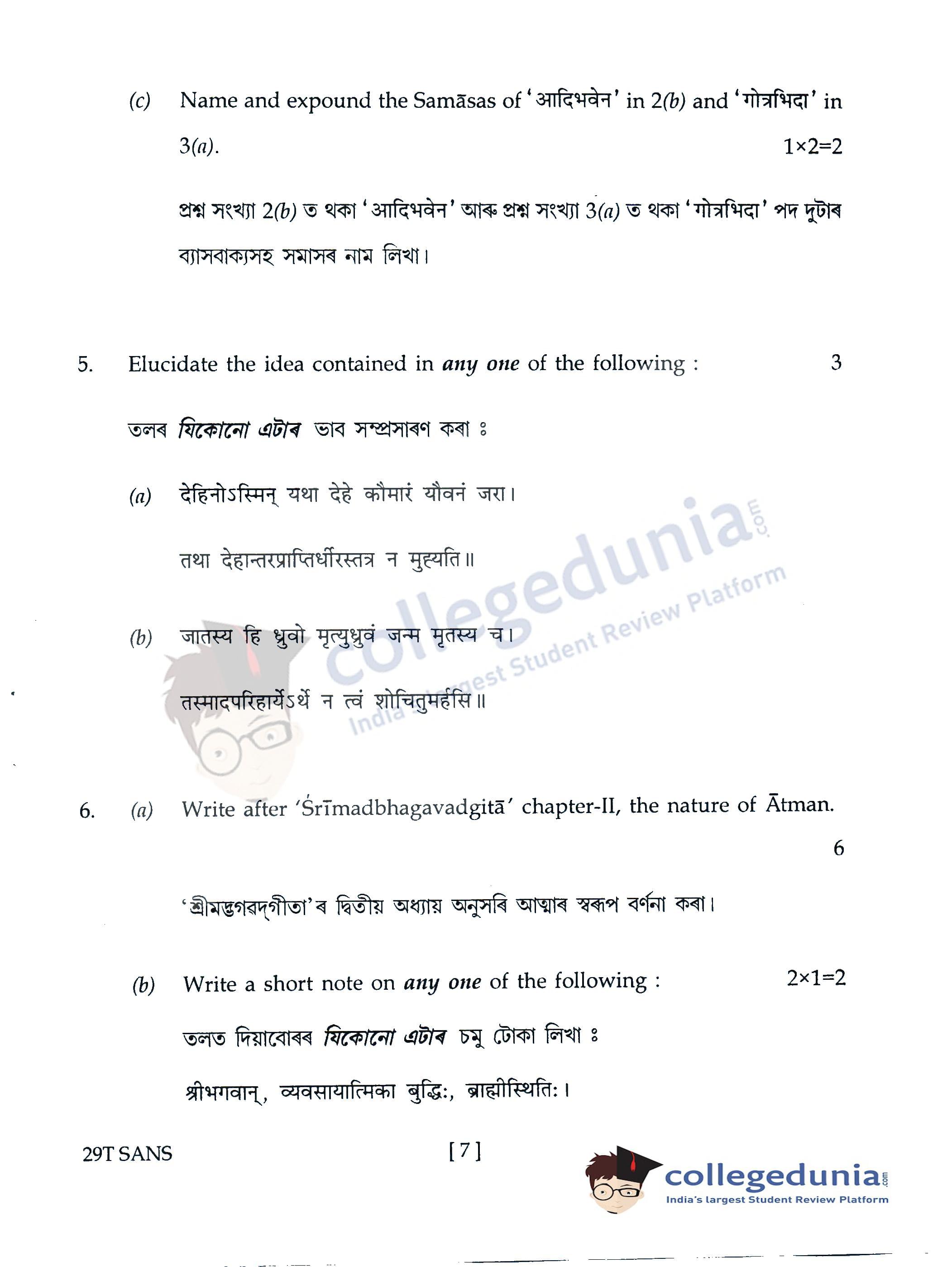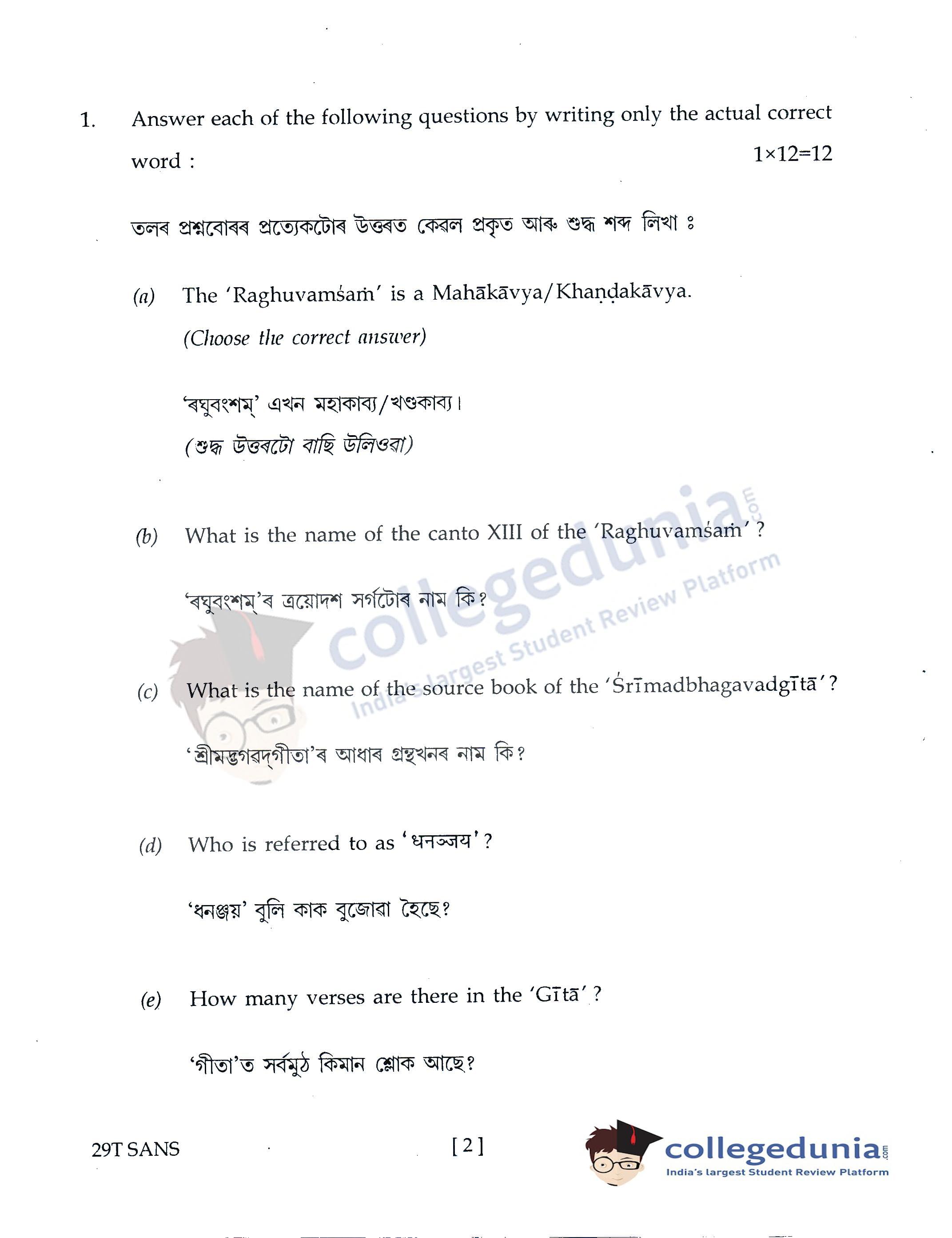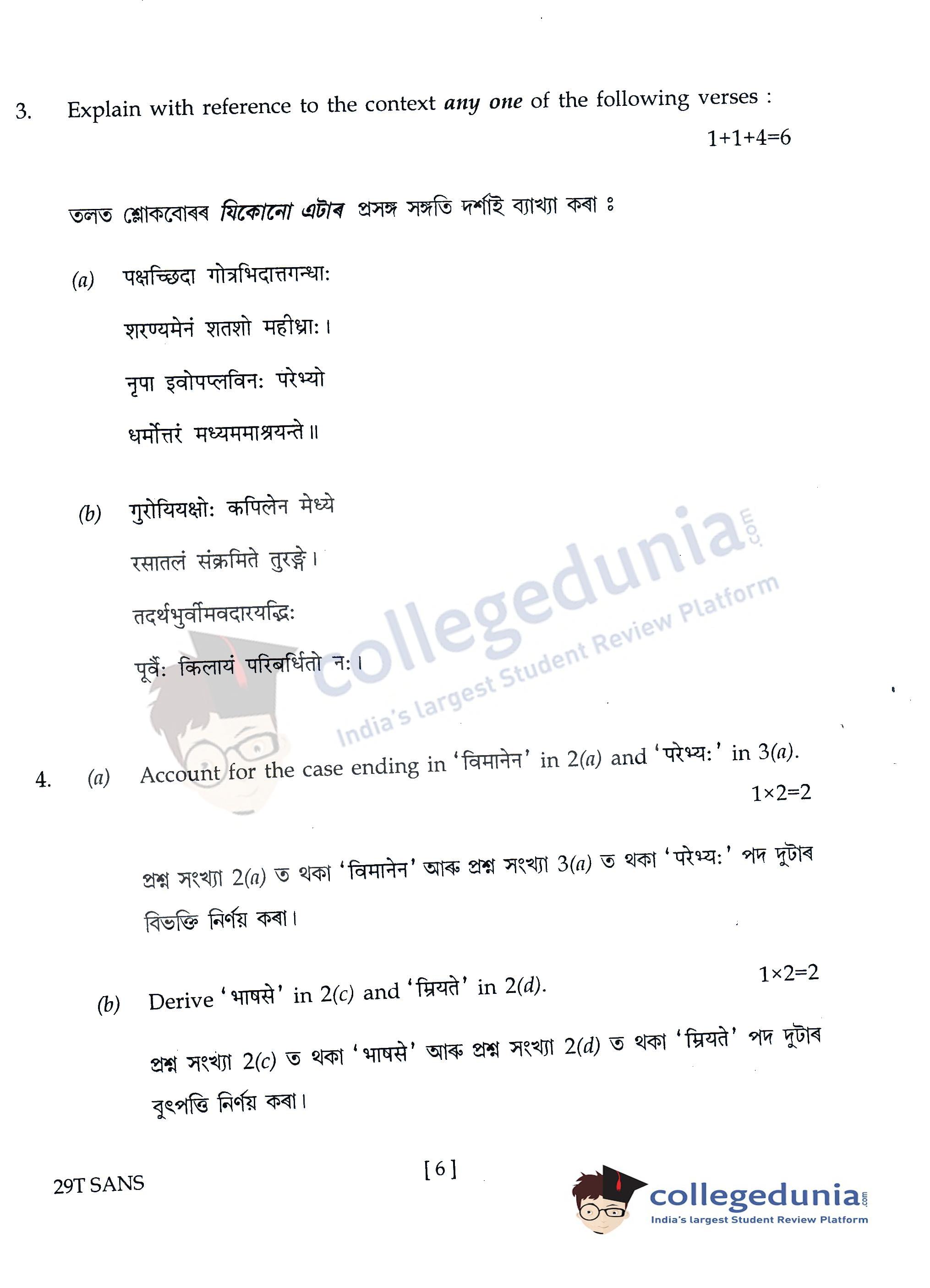 Assam HS 2nd Year Sanskrit Question Paper 2019 with Answer Key (February 16)