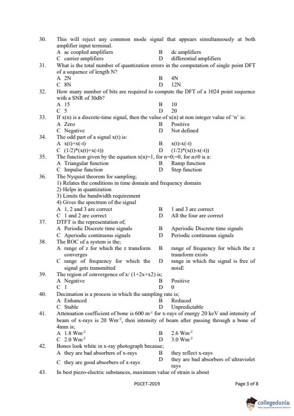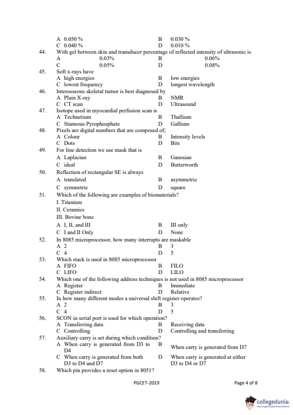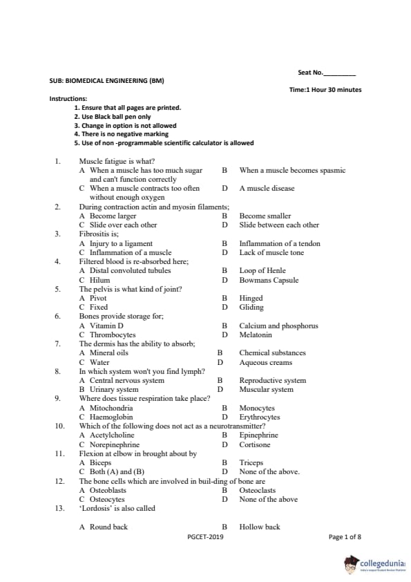 Gujarat PGECET 2019 BIOMEDICAL ENGINEERING (BM) Question Paper with Answer Key PDFs