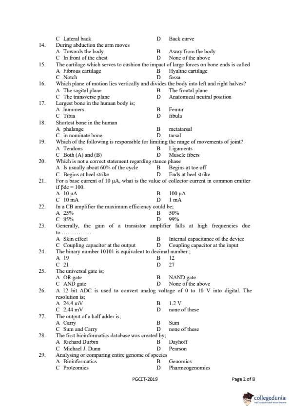 Gujarat PGECET 2019 BIOMEDICAL ENGINEERING (BM) Question paper with answer key pdf conducted on July 13, 2019 is available for download. The exam was successfully organized by Admission Committee for Professional Courses (ACPC). The question paper comprised a total of 100 questions.