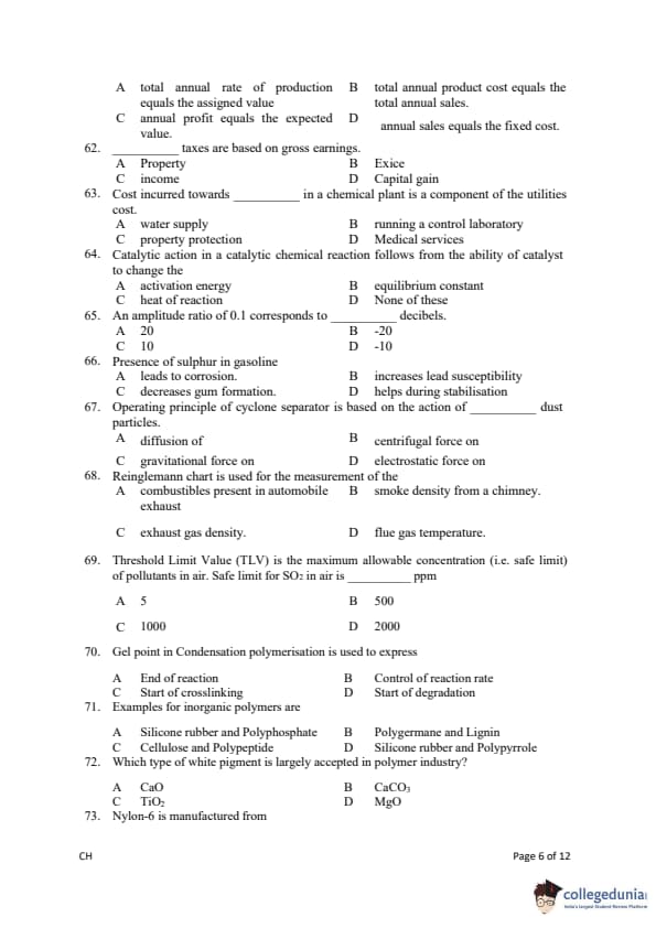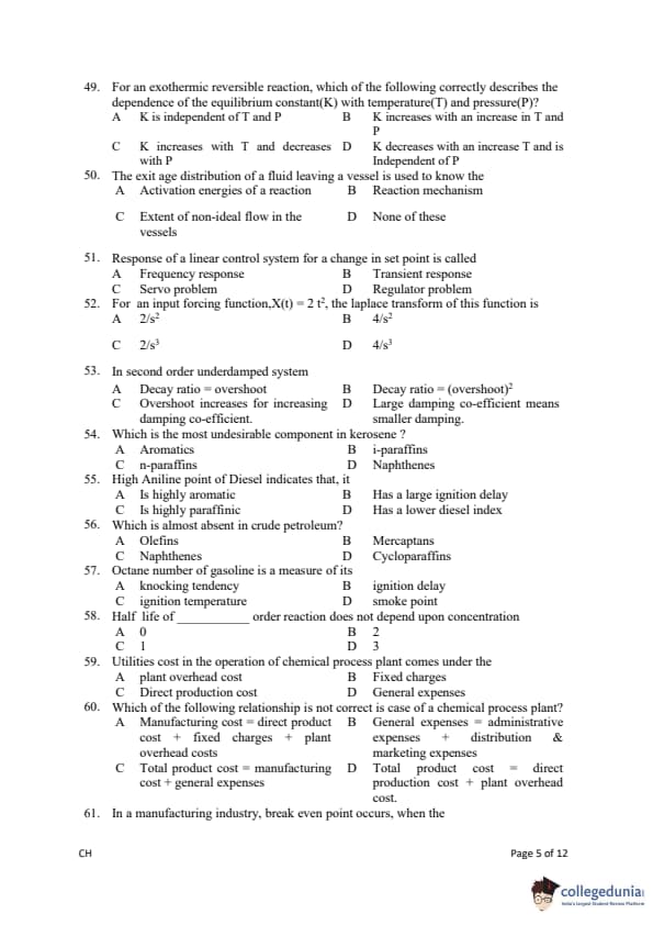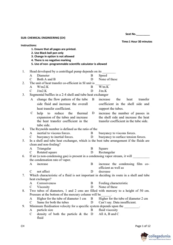 Gujarat PGECET 2019 CHEMICAL ENGINEERING (CH) Question paper with answer key pdf conducted on July 13, 2019 is available for download. The exam was successfully organized by Admission Committee for Professional Courses (ACPC). The question paper comprised a total of 100 questions.