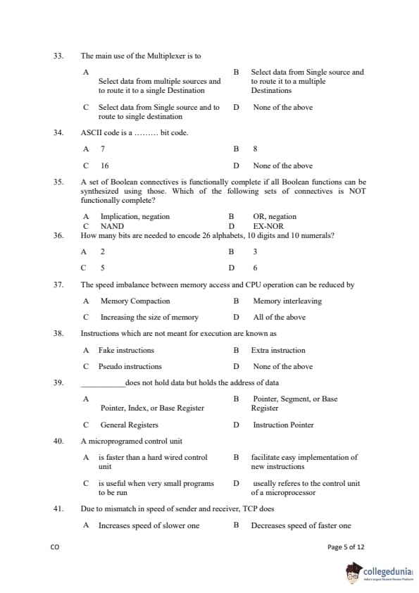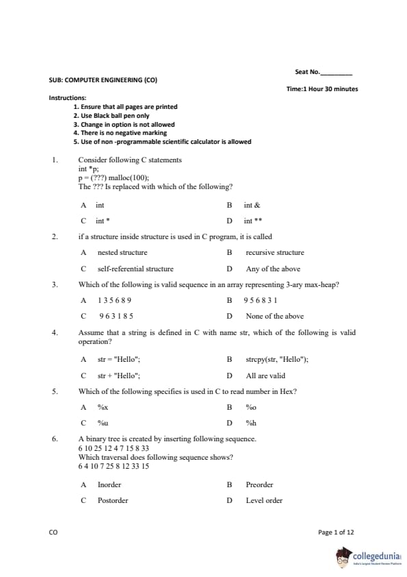 Gujarat PGECET 2019 COMPUTER ENGINEERING (CO) Question paper with answer key pdf conducted on July 14, 2019 is available for download. The exam was successfully organized by Admission Committee for Professional Courses (ACPC). The question paper comprised a total of 100 questions.