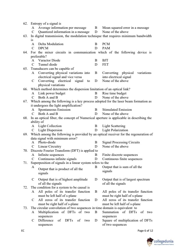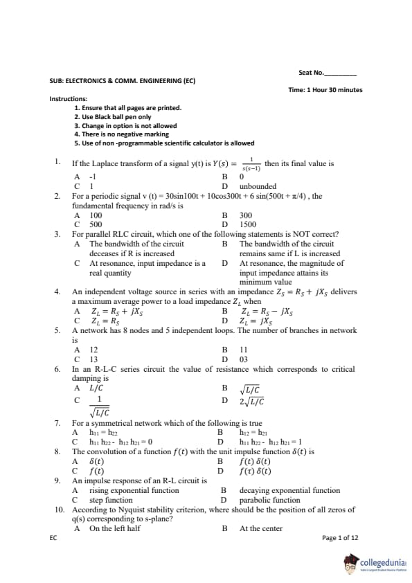 Gujarat PGECET 2019 ELECTRONICS & COMMUNICATION ENGINEERING (EC) Question paper with answer key pdf conducted on July 13, 2019 is available for download. The exam was successfully organized by Admission Committee for Professional Courses (ACPC). The question paper comprised a total of 100 questions.