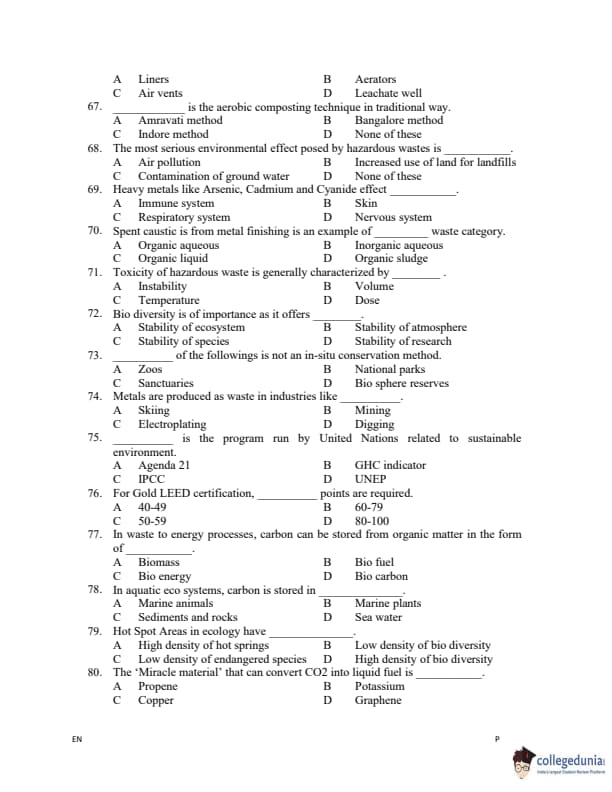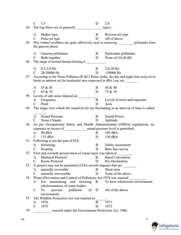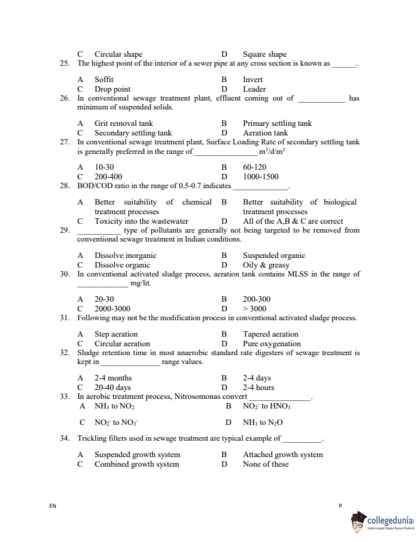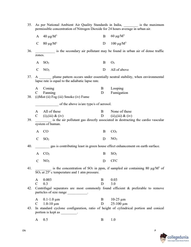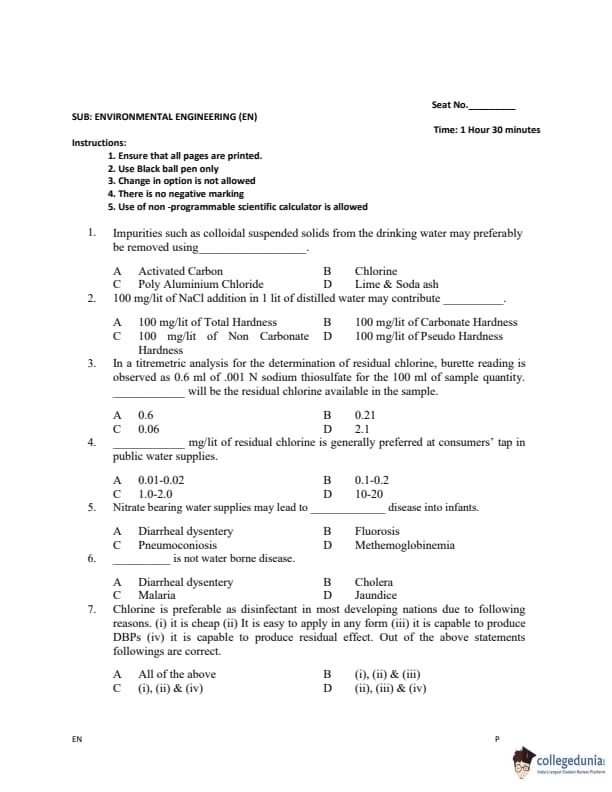 Gujarat PGECET 2019 ENVIRONMENTAL ENGINEERING (EN) Question paper with answer key pdf conducted on July 13, 2019 is available for download. The exam was successfully organized by Admission Committee for Professional Courses (ACPC). The question paper comprised a total of 100 questions.