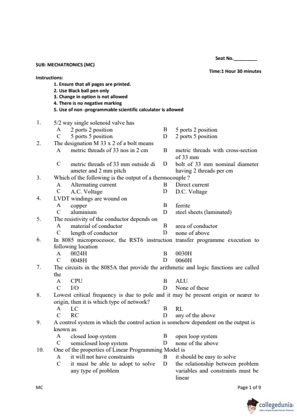 Gujarat PGECET 2019 MECHATRONICS (MC) Question Paper with Answer Key PDFs