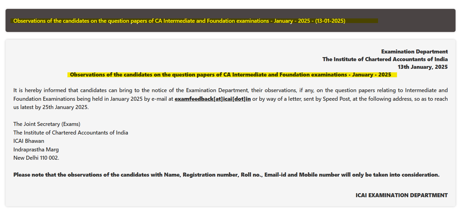 Candidates wishing to share their observations must follow the guidelines provided by the ICAI. Observations should be submitted by email at examfeedback@icai.in or sent via Speed Post to the following address: