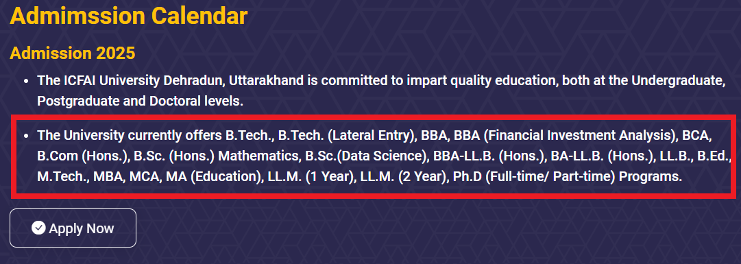 ICFAI University currently inviting applications for admission in multiple courses for 2025. The courses include B.Tech., B.Tech. (Lateral Entry), BBA, BBA (Financial Investment Analysis), BCA, B.Com (Hons.), B.Sc. (Hons.) Mathematics, B.Sc.(Data Science), BBA-LL.B. (Hons.), BA-LL.B. (Hons.), LL.B., B.Ed., M.Tech., MBA, MCA, MA (Education), LL.M. (1 Year), LL.M. (2 Year), Ph.D (Full-time/ Part-time) Programs.
