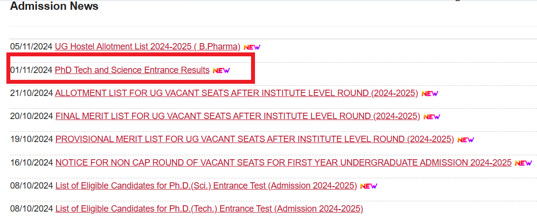 Find the Ph.D. Entrance Results: Locate the link specifically for "Ph.D. Tech and Science Entrance Results."