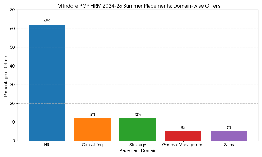 The HR domain led the placements with 62% of offers, followed by Consulting (12%), Strategy (12%), General Management (5%), and Sales (5%).