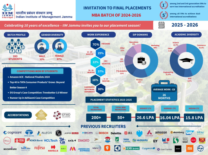 IIM, Jammu, now one of only five IIMs to secure both BGA and EFMD accreditations, invites corporate partners to its Final Placements Season for the 2024–26 MBA batch, boasting strong academic and industry traction.