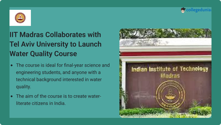 New Delhi: Indian Institute of Technology Madras (IIT Madras) has partnered with Tel Aviv University, Israel, and KMCH-Research Foundation (KMCH-RF), Coimbatore, to offer a water quality course. Registration for the course is ongoing and shall be open till July 20, 2024. Interested candidates can apply through the direct link given below:
