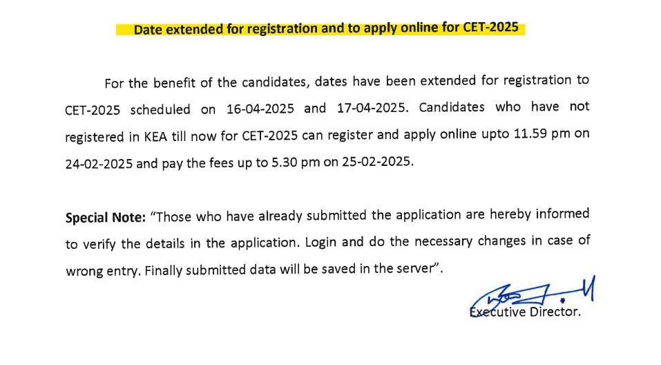The Karnataka Examinations Authority (KEA) has announced an extension for the Karnataka Common Entrance Test (KCET) 2025 registration deadline. Candidates now have until February 24, 2025, to submit their applications online. The deadline for application fee payment has also been extended to February 25, 2025.
