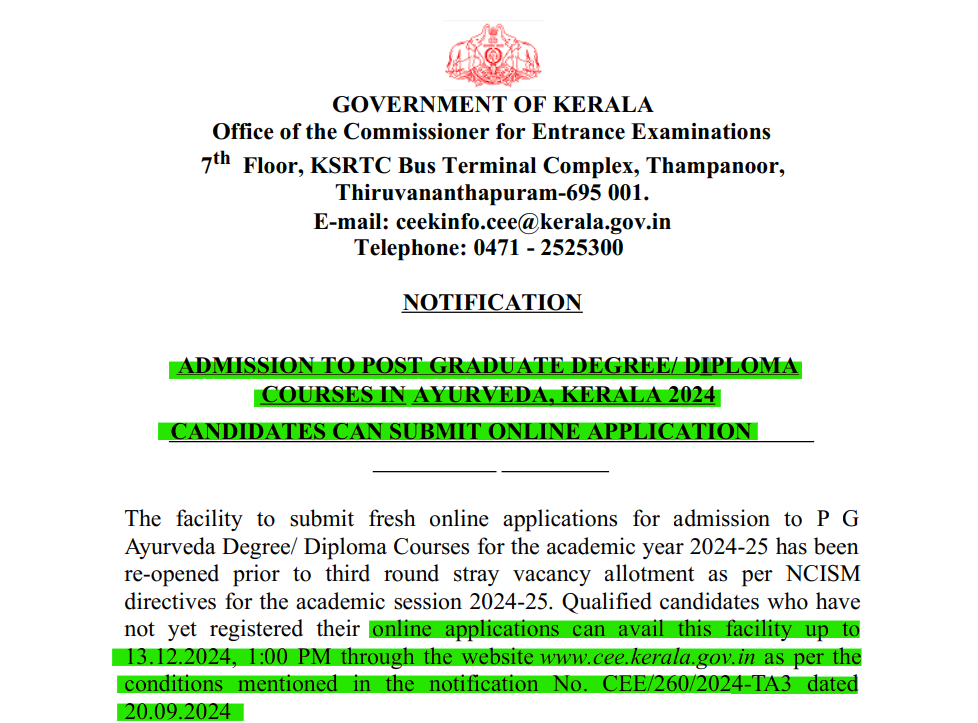 Fresh Applications Open: Qualified candidates can submit online applications for PG Ayurveda courses via the official portal until 1:00 PM on December 13, 2024. Applicants are required to upload essential documents and pay the application fee online.