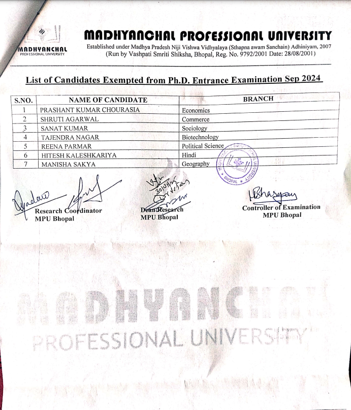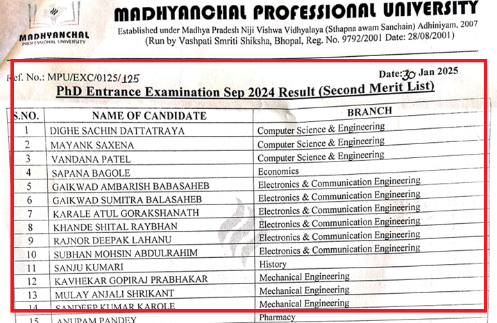 Madhyanchal Professional University (MPU) Bhopal has officially released the results of the Ph.D. Entrance Exam conducted in September 2024. The university has published the second merit list of selected candidates, now available on the official website @mpu.ac.in.