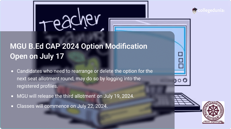 MGU B.Ed CAP 2024 Round 2 option modification is open on July 17, 2024. The third allotment will be declared on July 19, 2024.