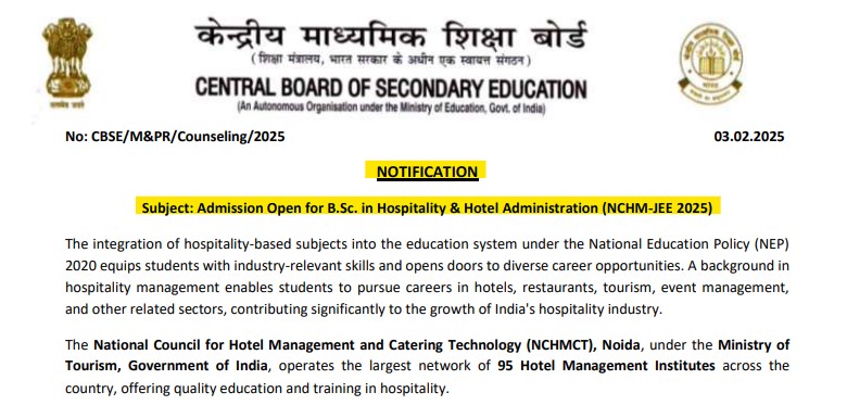 CBSE Official Notice for B.Sc. in Hospitality & Hotel Administration NCHM JEE 2025