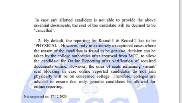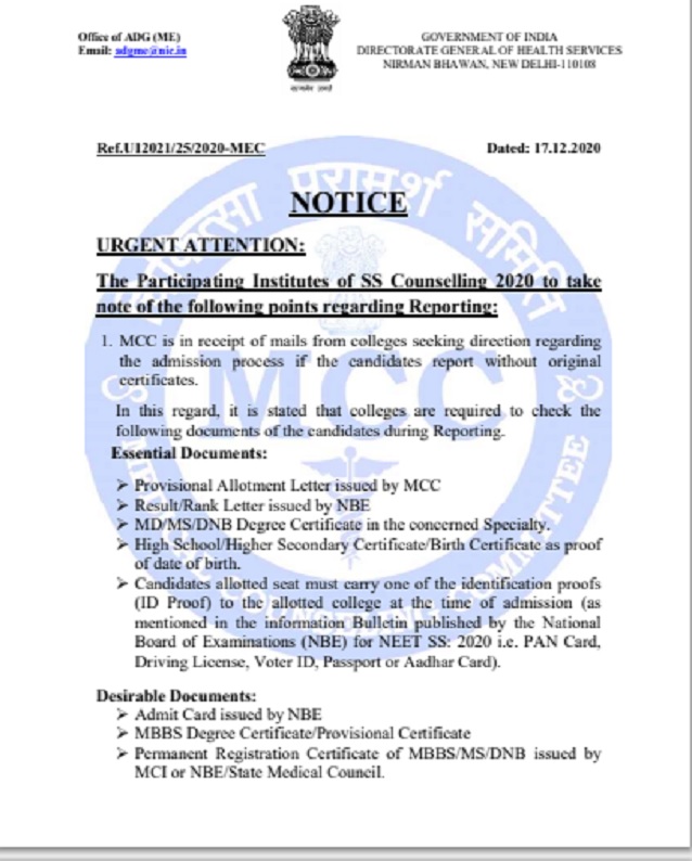 The notification was issued by the MCC after receiving a number of e-mails from colleges seeking guidance on the NEET SS 2020 admission process; in the case of candidates reporting without original certificates.
