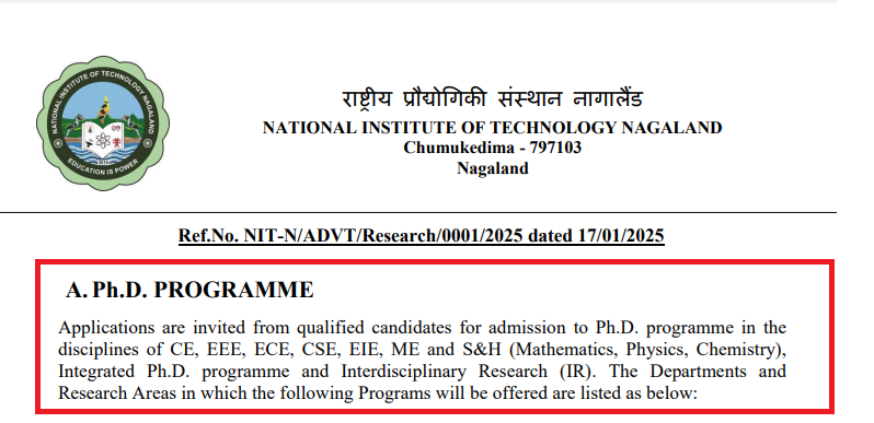 | Direct Link: NIT Nagaland PhD Admission Application Form 2025 |