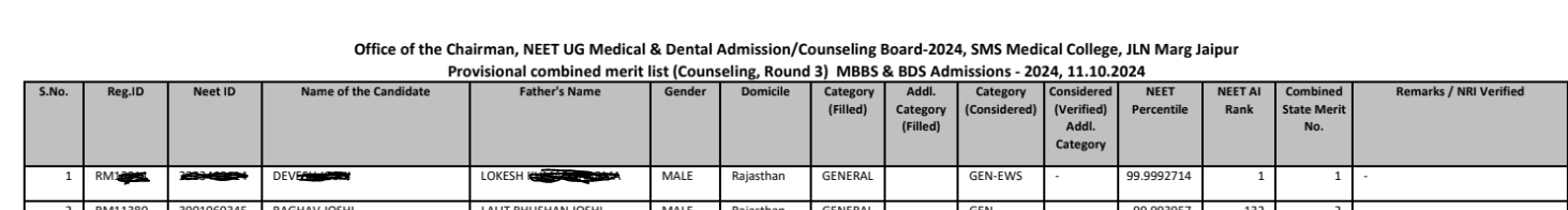 On October 11, 2024, the Rajasthan NEET counselling authorities released the Provisional Merit List for Combined Round 3. This list plays an important role in determining the eligibility of candidates for the upcoming counselling rounds.