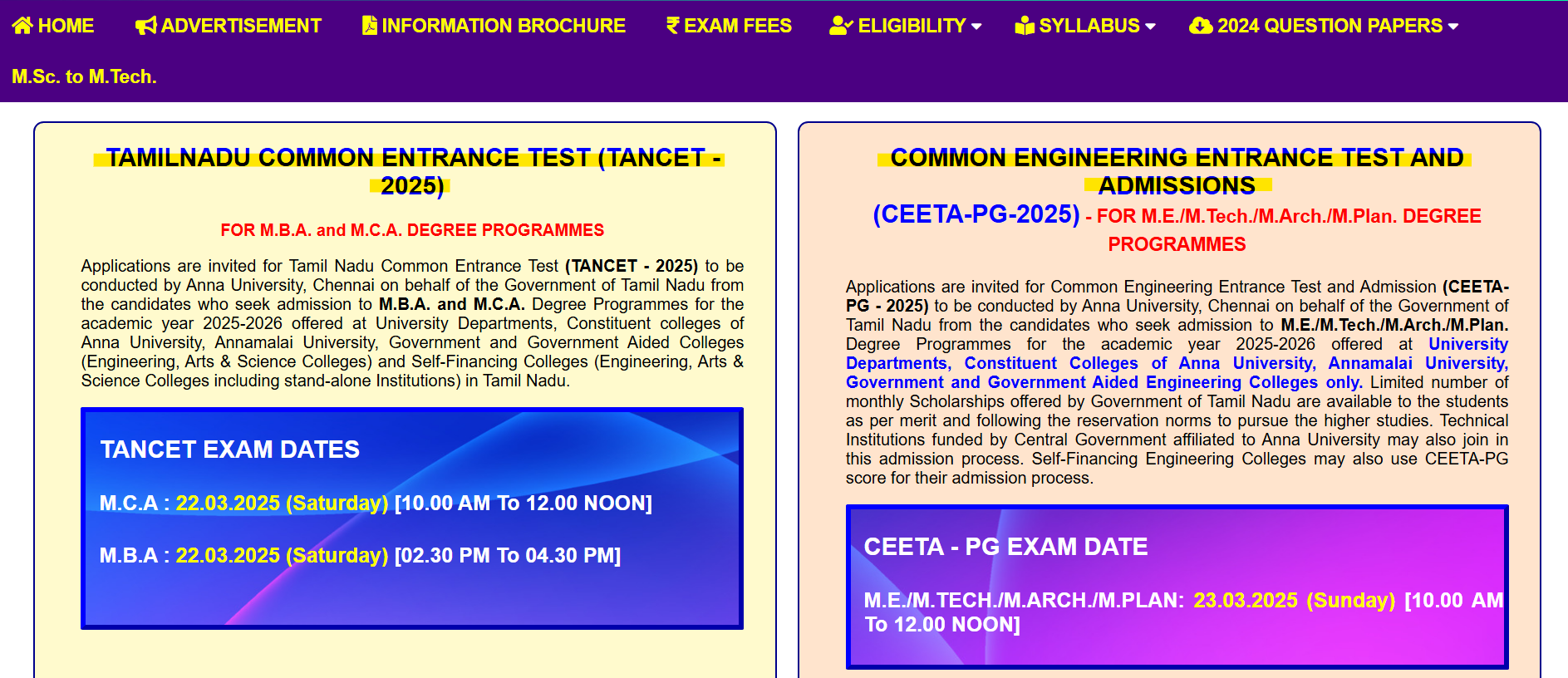 | TANCET (MCA) | March 22, 2025 | 10:00 AM – 12:00 Noon |