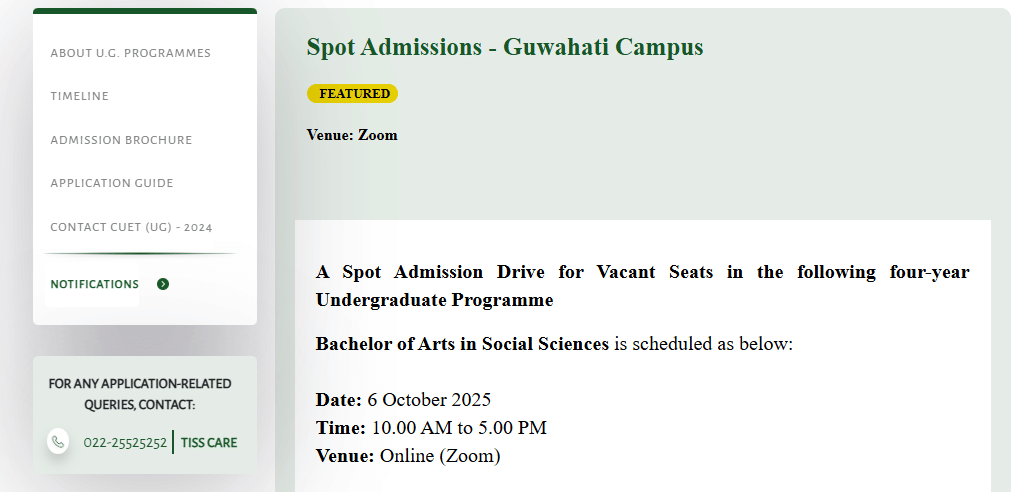 Tata Institute of Social Sciences (TISS), Guwahati is set to hold a spot admission drive on October 6, 2025 from 10:00 AM to 5:00 PM for vacant seats in its four-year BA in Social Sciences (BASS) program.