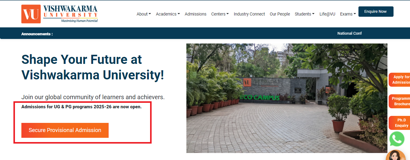 Vishwakarma University UG/PG 2025-26 Admission Process