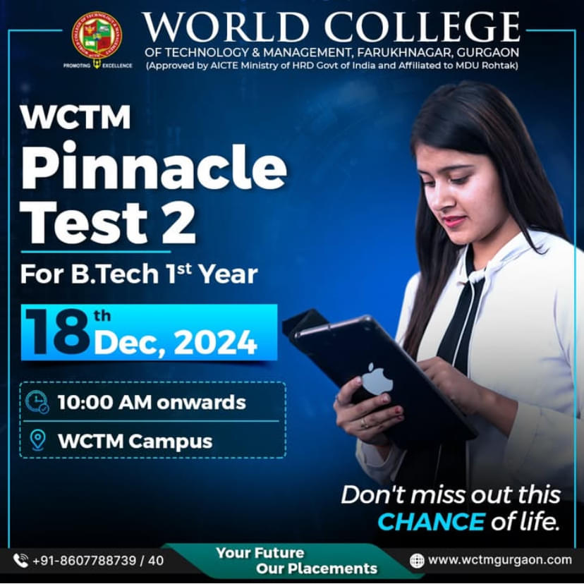 My name is riya sharma a student of BCA 3rd year world college of technologyand management Gurgaon so came let us tell you about wctm my experience in wctm has been very gud i have been very gud guidance from here the very first day the staff members here are very good all arr Phd holder and well qualifies faculties the infrastructure , facilities and decorum of college was very good descipline is properly maintained . There are activities in the college for the students just like freshers , farewell , cultural fest ,zenith , world premier league , sports day , festival celebration and many more , and they also provide for us seminars ,webinars , different kind of session , industrial visits , and the india's best spoke persons came our campus to adress us and teach us good for our bright future , they provide us different kind of trainings and certification courses like apple ios , panasonic labs , microsoft training , HTML ,JAVA , C++ , goland ,software technology and many more and we get to learn a lot of new things and also the transport facilities are also very gud and safe complete AC and comfortable buses and they give full attending to the safety and security and we have a great placement and internship opportunity from our campus and also teachers help us to preapare for our exams properly i can say proudly that choosing WCTM was the best decision of my life and for my bright future and i wants to say thanks to all the WCTM family and i want to say WCTM is the best college ever i suggest to all my new comers please come and enjoy the life of WCTM Thankyou .....