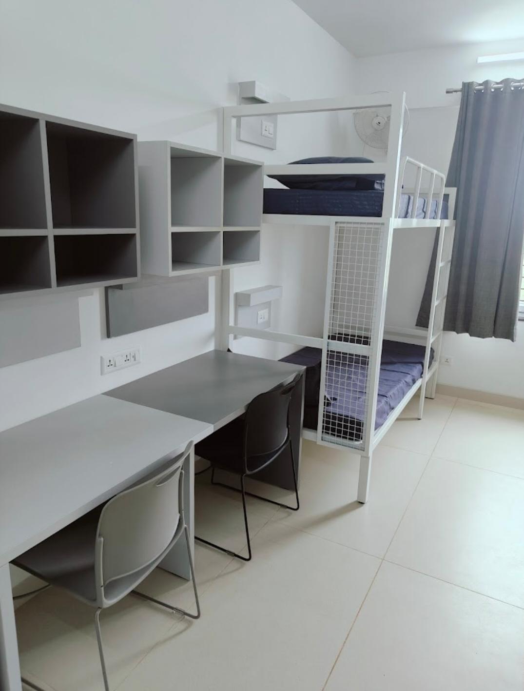 Room facilities are 2 cots and 2 bes sheets one cupboard ,study table, hangers. Three times meal week a day. And daily one special item. We have to register hostel room by paying fee from online in process .