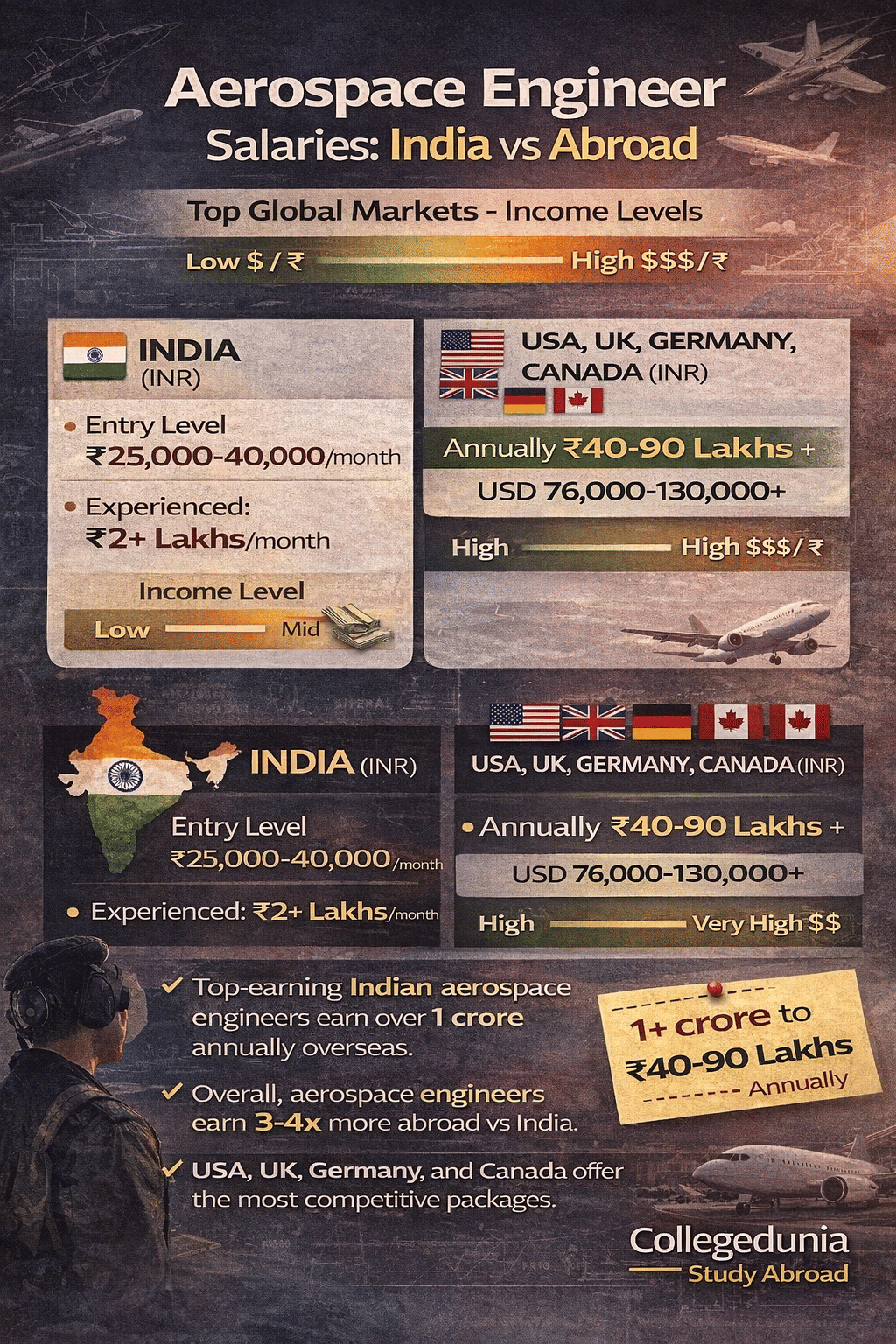 Aerospace engineering offers one of the most lucrative career paths globally, but salary expectations vary a lot between India and developed nations. In India, entry-level aerospace engineers earn INR 25,000-40,000 monthly, while experienced professionals earn INR 2+ lakhs. Internationally, the picture is starkly different: the USA pays USD 76,000-130,000+ annually (INR 63.6 lakhs to 1+ crore), while the UK, Germany, and Canada offer competitive packages ranging from INR 40-90 lakhs annually.