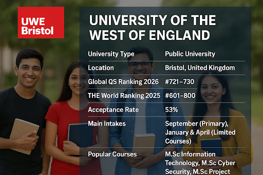 The University of the West of England is commonly known as UWE Bristol. It is a UK public university located in Bristol, offering over 600 undergraduate and postgraduate degrees in areas like Business, Engineering, Health, Design, and Law. Some of the most popular courses at the university include MSc in Information Technology, MSc in Cyber Security and MSc in Project Management. It is ranked in the #721–730 range globally by QS World University Rankings 2026, and in the #601–800 band by Times Higher Education (THE) 2025.