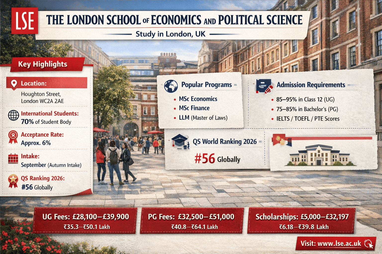 The London School of Economics and Political Science (LSE) is a Russell Group university located in London, United Kingdom. It has a highly diverse student population, with around 70% international students from over 140 countries. The university does not officially publish its acceptance rate; however, based on available data, it is estimated to be around 6%. In the QS World University Rankings 2026, LSE is ranked #56.