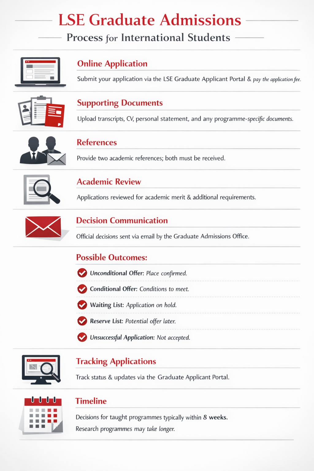 - Waiting list: The application is strong, but LSE requires more time to compare it against other candidates. No additional documents are needed during this period, and a final decision is usually made within eight weeks.