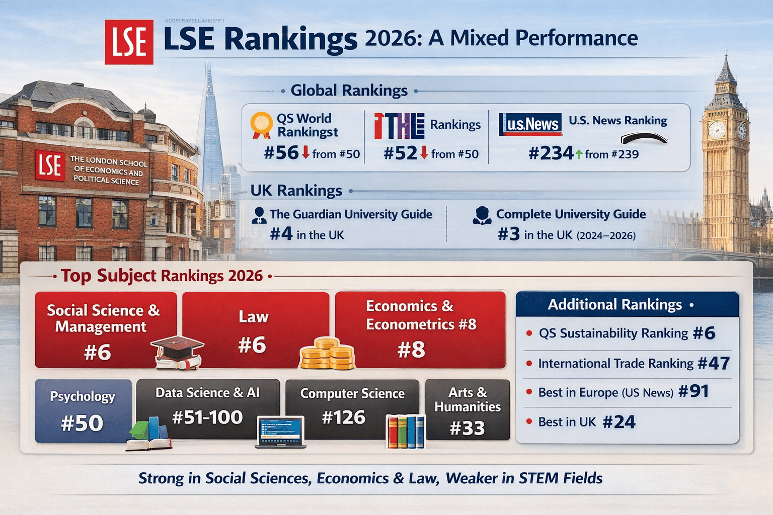 At the subject level, LSE demonstrates exceptional strength in social sciences, economics, and law.