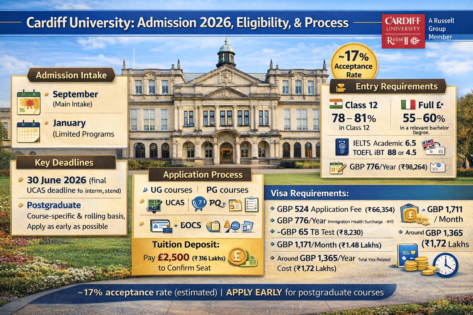 Cardiff University does not publish an official acceptance rate, but it is generally considered competitive, with estimates from third-party sources suggesting around 17%, depending on the program. Students with a strong academic profile and a well-prepared application have a better chance of admission.
