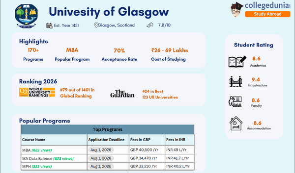 | Scholarships (India-specific) | India Excellence Award: £12,500 (~₹15.6 Lakhs) tuition waiver World Changers Glasgow Scholarship: £5,000 (~₹6.3 Lakhs) discount |