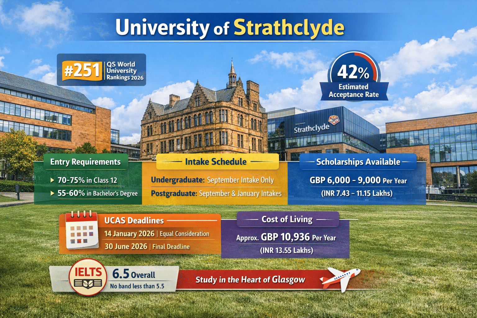The University of Strathclyde's official website does not publish any acceptance rate, but it is estimated to be around 42% from various third-party sources. The university follows a fixed fee structure, where the tuition fee varies depending on the course. Apart from this, students must ensure they meet the basic requirements, such as 70-75% in Class 12 for undergraduate programs and 55-60% in a bachelor’s degree for postgraduate programs. In both cases, students are also required to submit proof of English language proficiency through tests such as IELTS or equivalent. Students can apply for the university through the UCAS portal or the university’s official website, depending on the level of study.