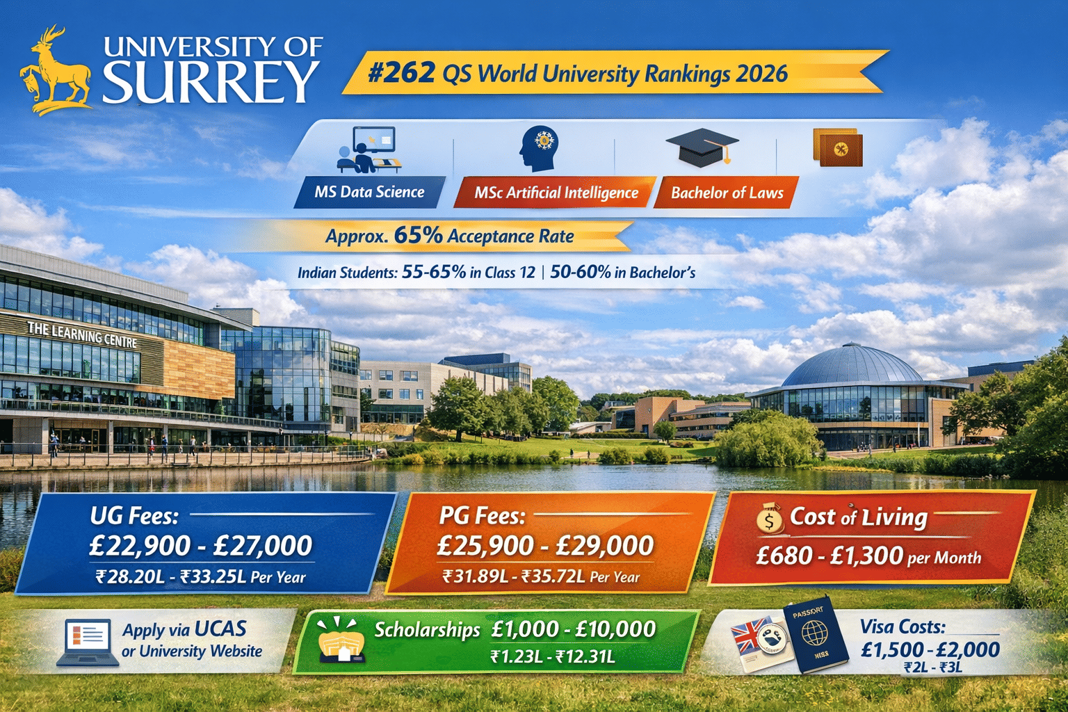 The University of Surrey is a well-recognised UK university offering a wide range of undergraduate and postgraduate courses for international students. For the 2026 intake, tuition fees typically range from £22,900 to £27,000 (INR 28.20 - 33.25 Lakhs) per year for undergraduate programs and from £20,700 to £29,000 (INR 25.49 - 36.71 Lakhs) per year for postgraduate courses, depending on the subject. In addition, students should plan for an average living cost of around £1,171 (INR 1.44 Lakhs) per month, as suggested by UK guidelines. The Indian students can also expect the total UK visa cost to be around £1,500 - 2,000 (INR 2-3 lakh), excluding tuition fees.